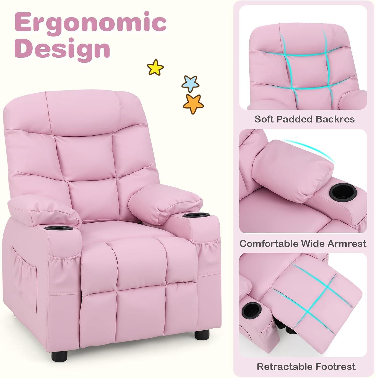 Kids Recliner, Kids Recliner Chair w/ 2 Cup Holders, PU Leather Chairs Comfy w/Adjustable Backrest & 3 Pockets, Toddler Furniture Sofa for Boys Girls Aged 3+(Pink)