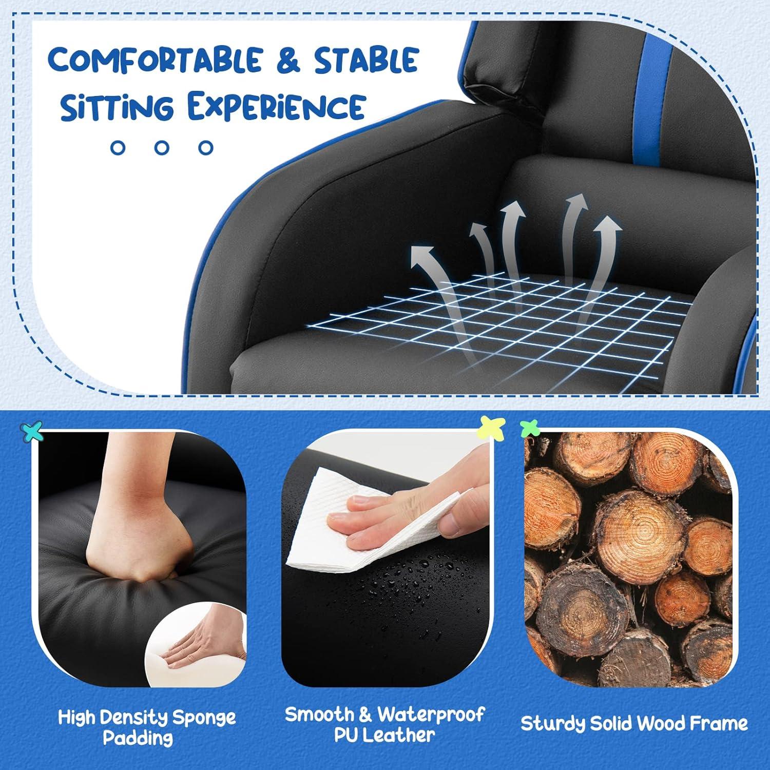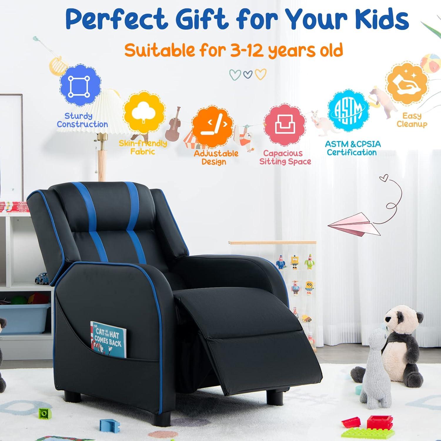 The recliner boasts a breathable leather exterior paired with a sturdy solid wood frame, ensuring durability and the ability to support up to 110 pounds. The chair sofa is padded with soft foam, providing a cozy seating experience. Its backrest is adjustable from 90° to 160°, while the extending footrest allows kids to read, watching and so on. Thoughtfully designed with 2 side pockets, it offers ample storage for children's favorite books and toys. Ergonomically crafted, the gaming chair features smooth, round armrests and a high backrest that conforms to the body's curves, ensuring kids can fully relax. This stylish and oversized children's sofa blends seamlessly into bedrooms, nurseries, or living rooms, making it an excellent gift choice.