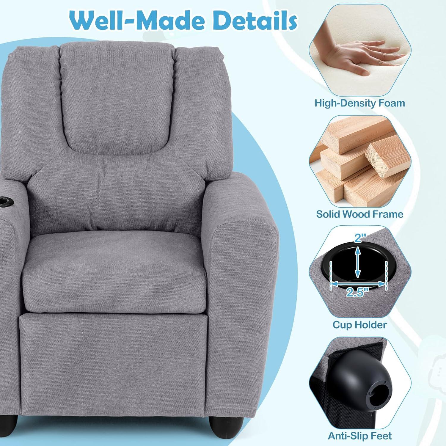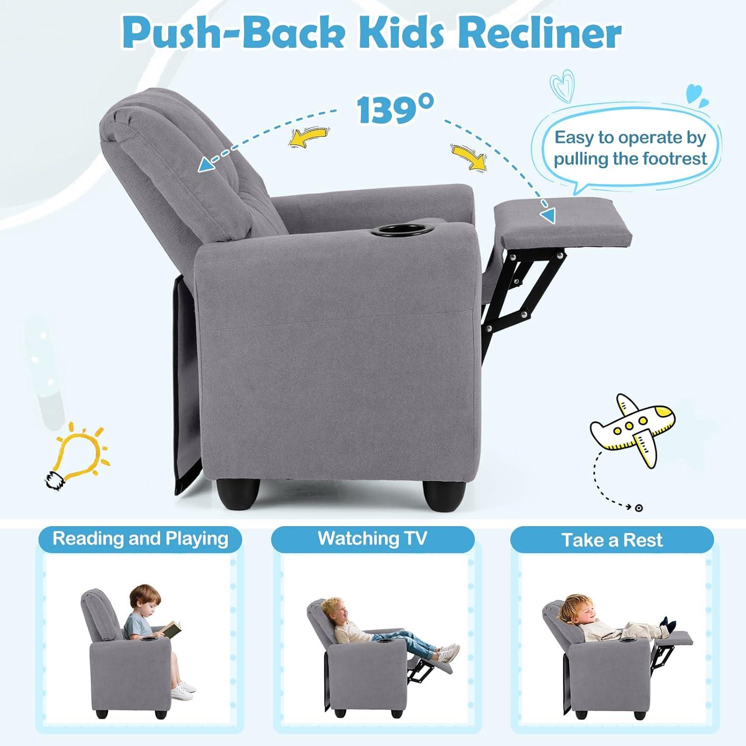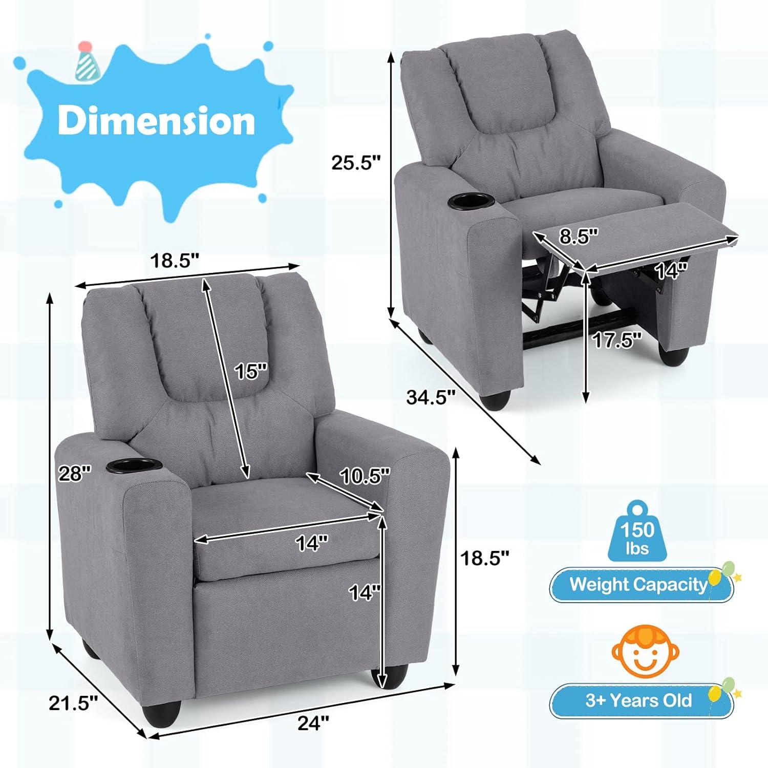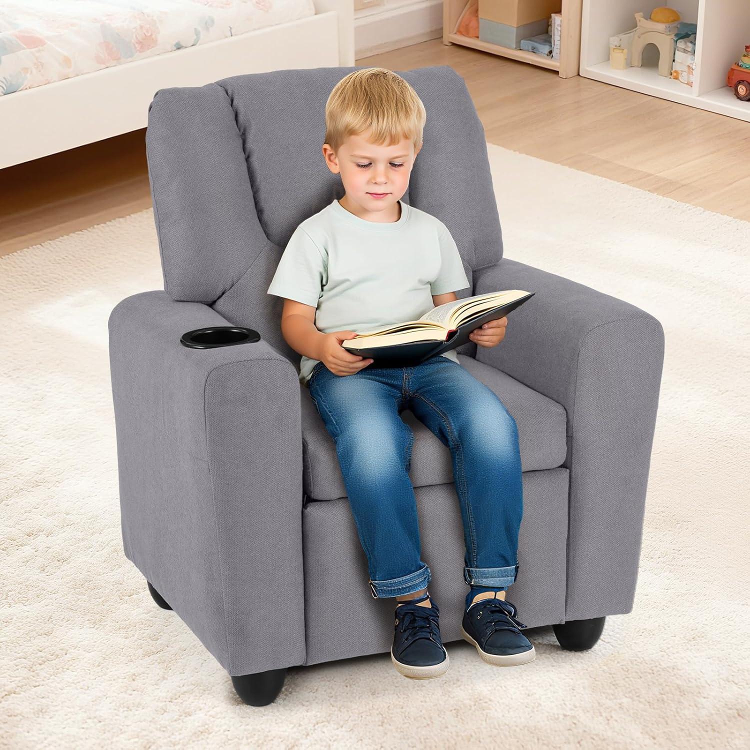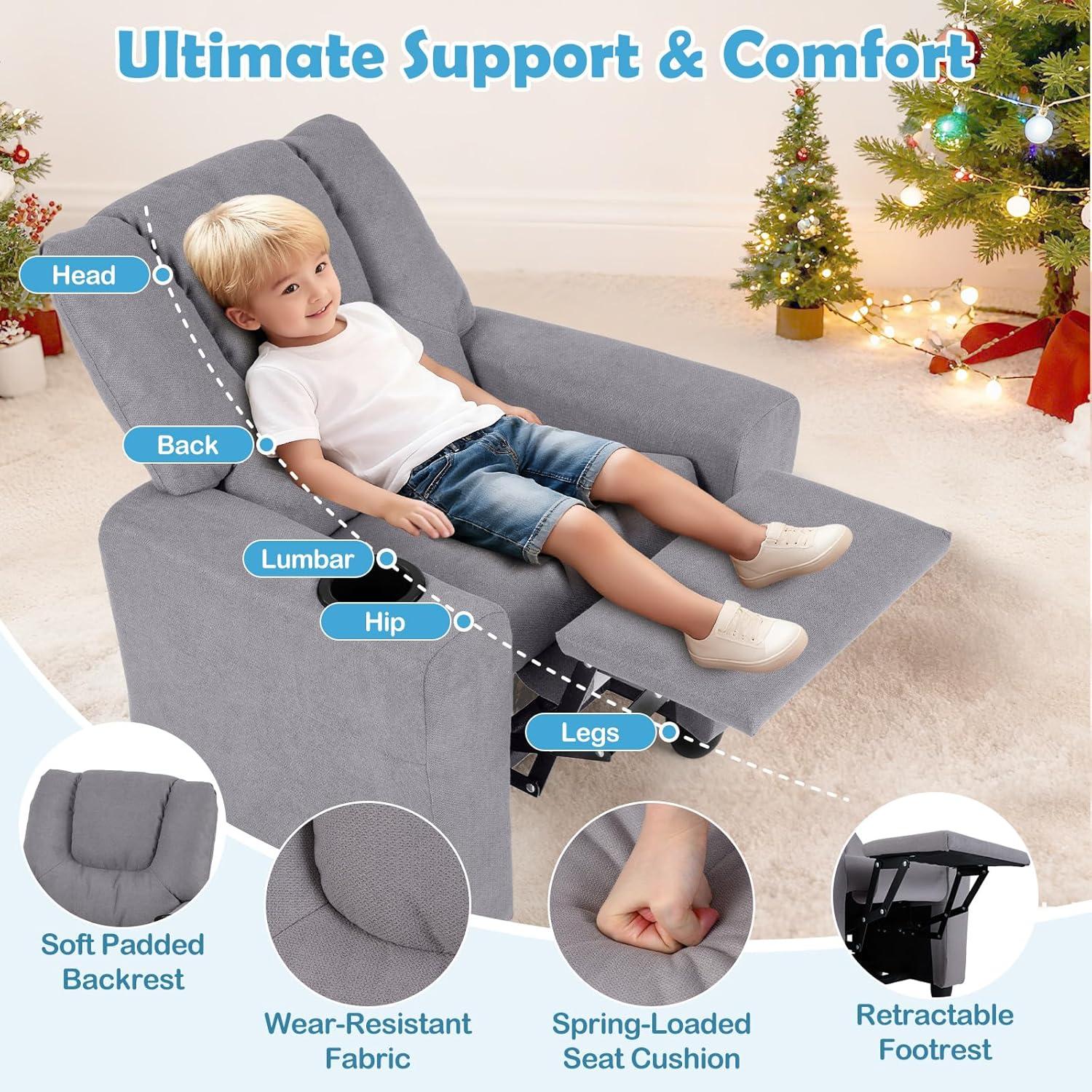 The recliner boasts wear-resistant fabric exterior paired with a sturdy solid wood frame, ensuring durability and the ability to support up to 150 pounds. The chair sofa is padded with soft foam, providing a cozy seating experience. Its backrest is adjustable to 139°, while the extending footrest allows kids to read, watch and nap. Thoughtfully designed with 1 cup holder, which can put the kids' water cups within their reach. Ergonomically crafted, the gaming chair features wide armrests and a high backrest that conforms to the body's curves, ensuring kids can fully relax. This stylish and oversized children's sofa blends seamlessly into bedrooms, nurseries, or living rooms, making it an excellent gift choice.