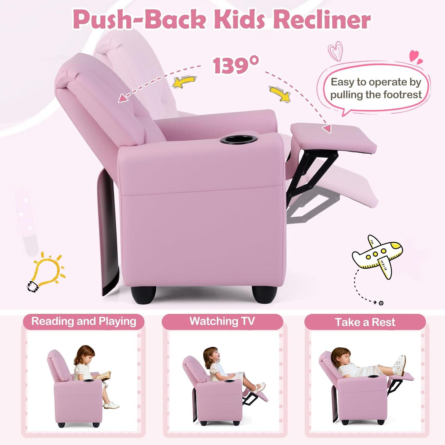 Adjustable Kids Sofa: The backrest of reclining chair is enable to recline to an angle of up to 139°. Kids have the flexibility to read a book, watch TV or enjoy a nap. As they lean back, the footrest automatically extends outward, providing a comfortable resting place for their feet.