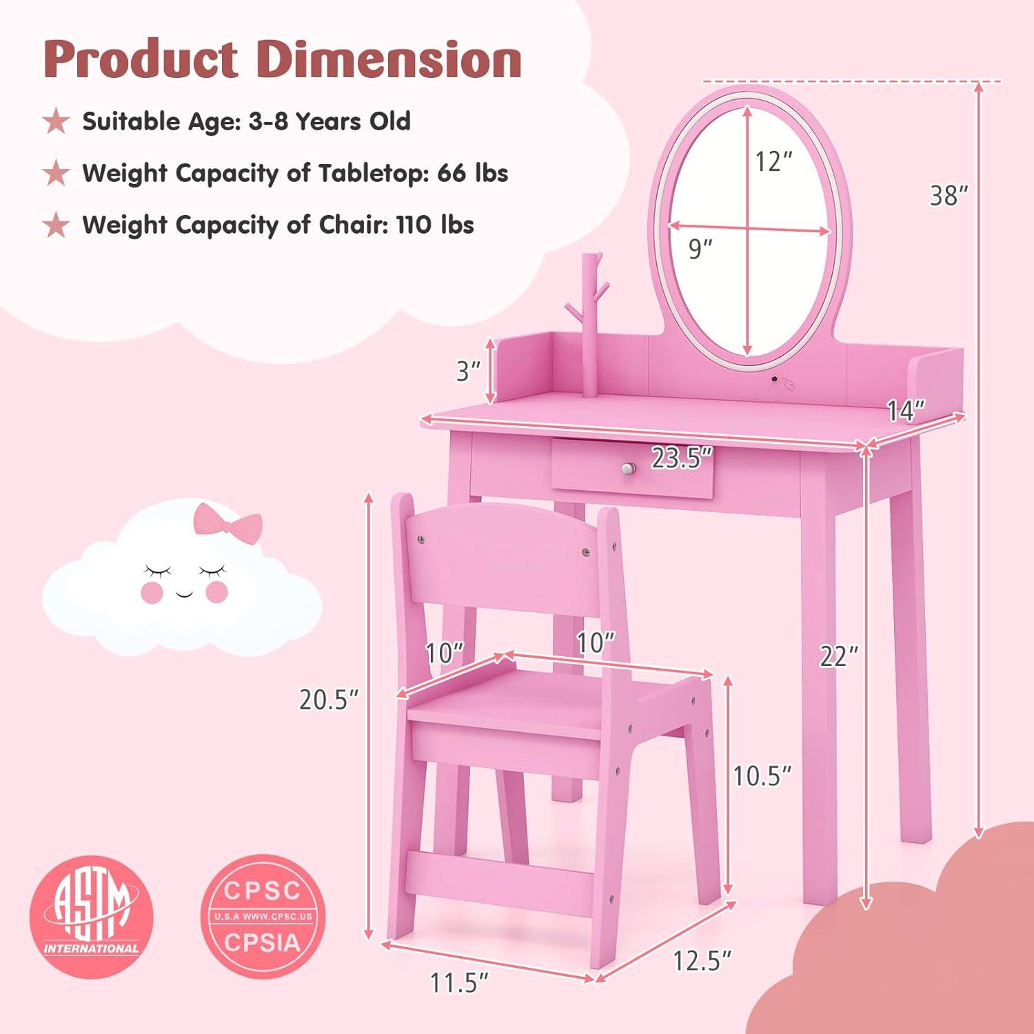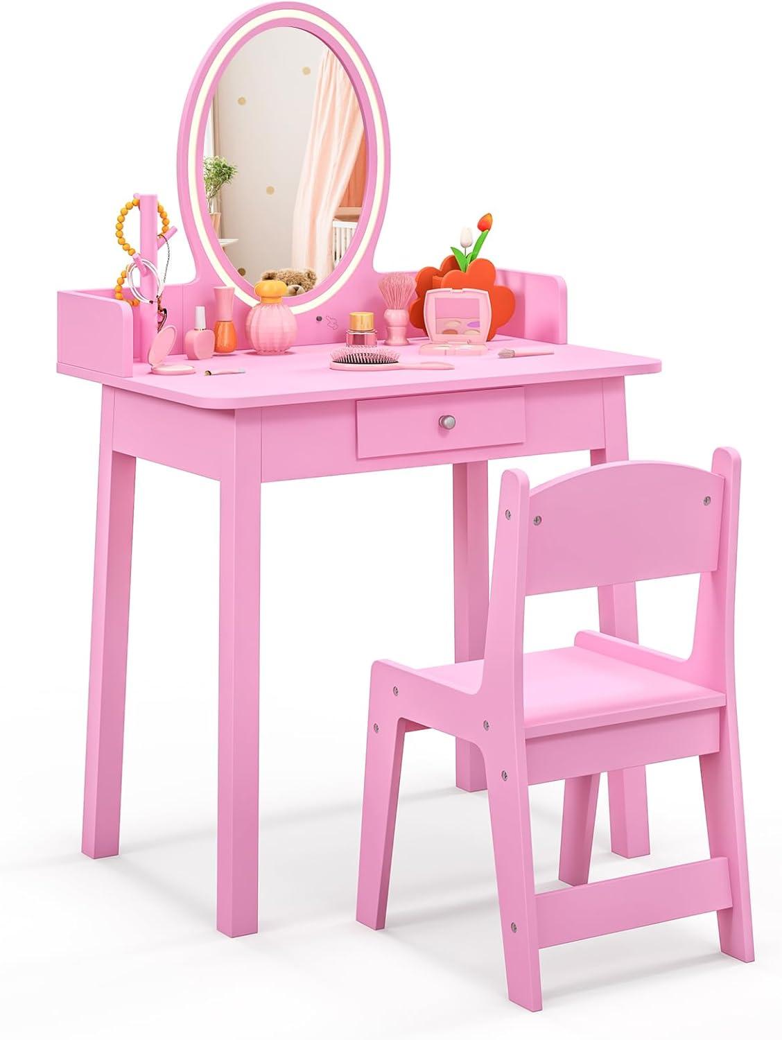 Kids Vanity, 2 in 1 Princess Dressing Table and Chair Set with Lighted Mirror & Storage Drawer, Wooden Toddler Make Up Desk Set for Little Girls Aged 3-8 Years (White)(Pink)