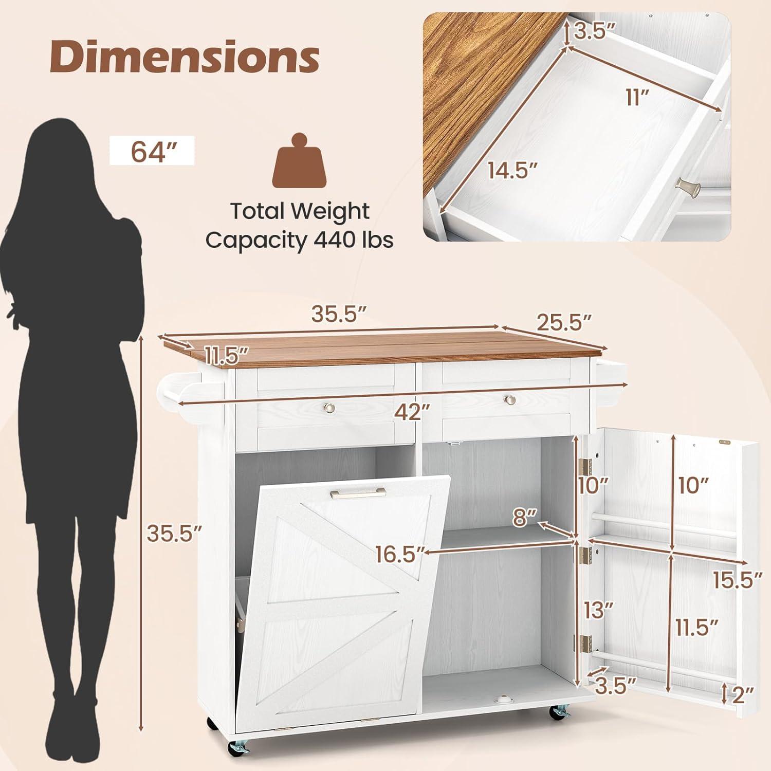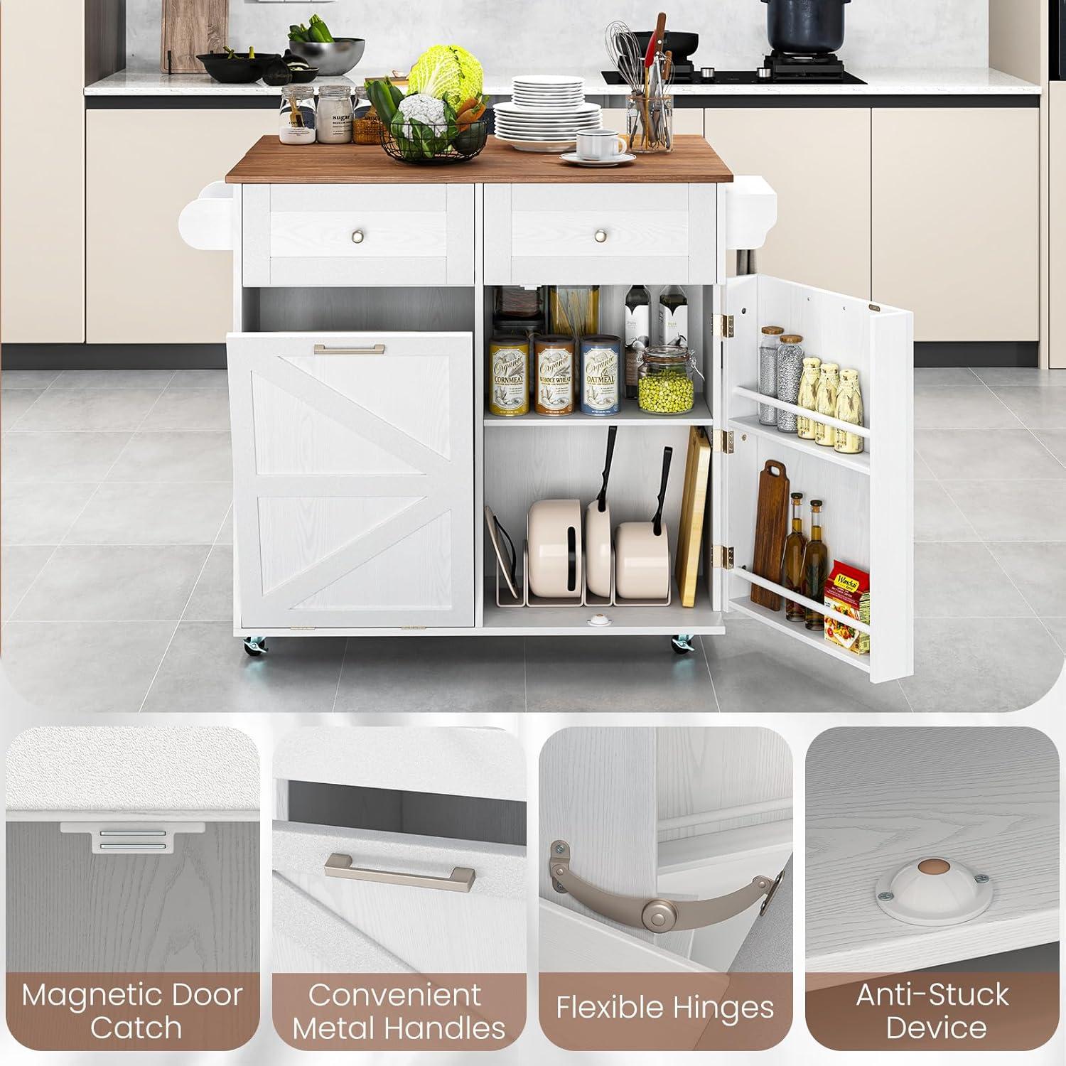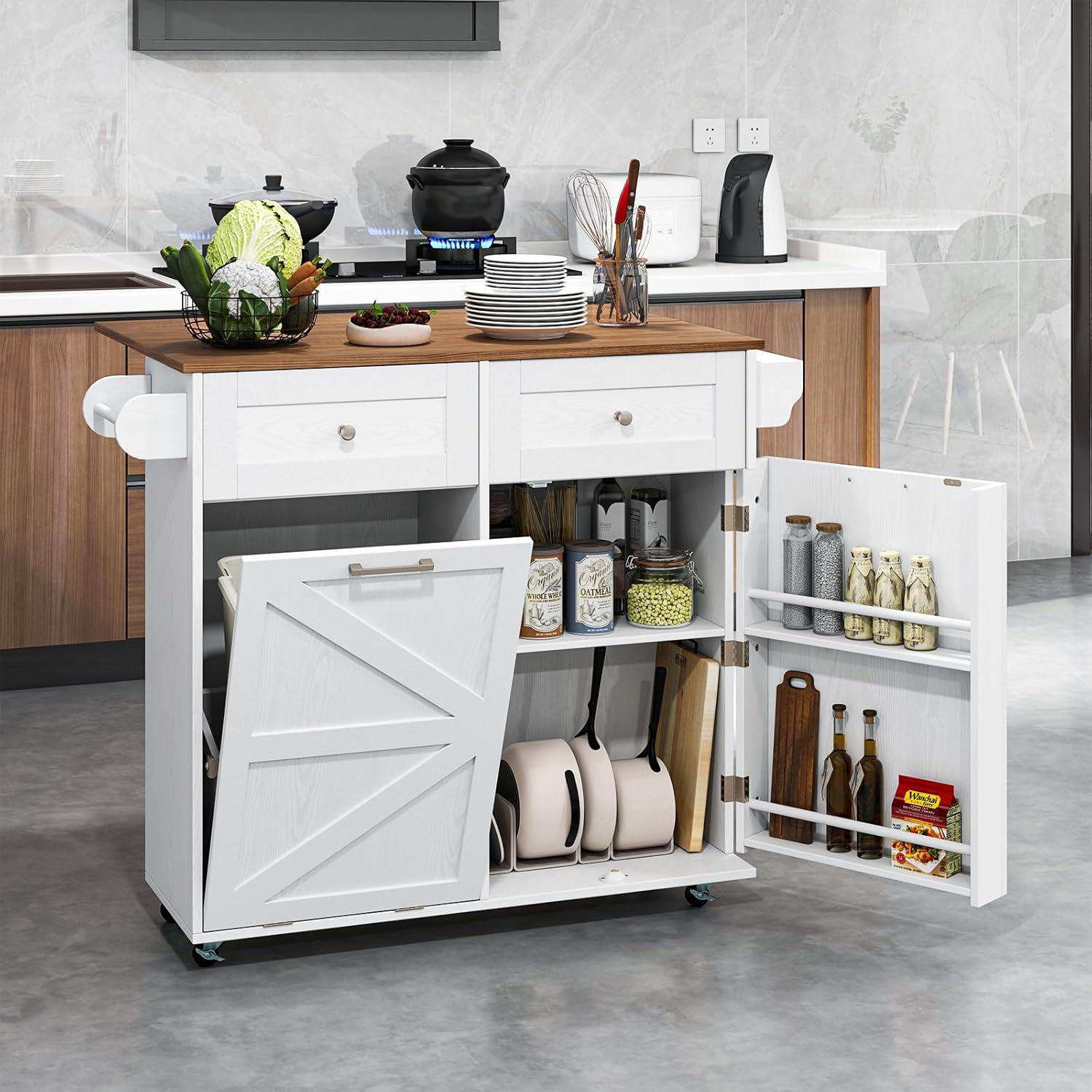 The foldable drop-leaf countertop gives you extra space for meal prep or casual dining, and it easily folds down to save room when you need it. The included tilt-out trash cabinet keeps your waste out of sight and your kitchen looking clean. Plus, with two lockable wheels and two 360° swivel wheels, this cart moves effortlessly from room to room—perfect for multitasking or entertaining.
