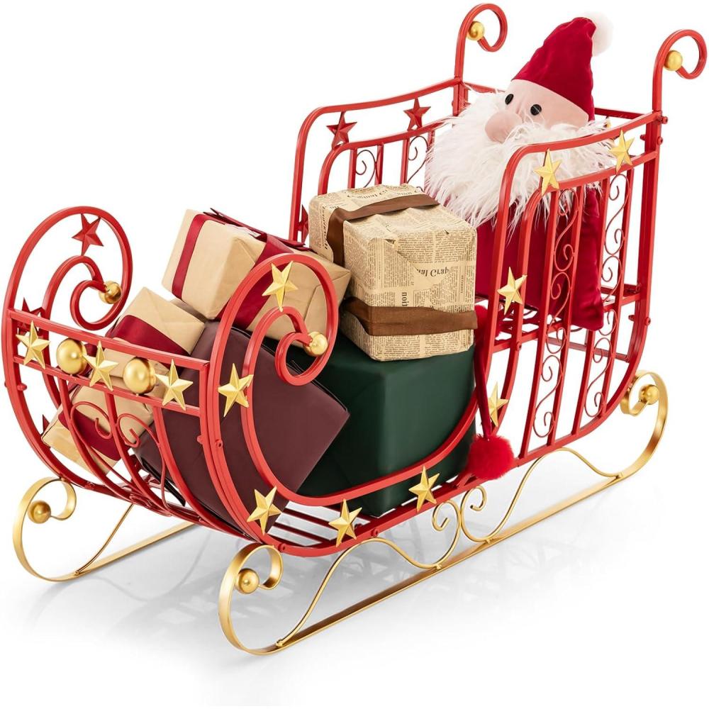 The classic sleigh silhouette—complete with a liquid-shine golden slide and star-shaped cut-outs—catches every twinkle-light and camera flash, so your decoration does the bragging for you. Deep Victorian curls frame a cargo bay big enough for mountains of gifts, bottles of cheer, or the cookie stash you swear is “for the kids.” Built-in side handles let you glide it from living-room centerpiece to office party HQ without spilling a single candy cane. Powder-coated steel shrugs off scratches, cocoa spills, and the annual attic trek, so this heirloom keeps its just-unwrapped sparkle for decades of Christmases.