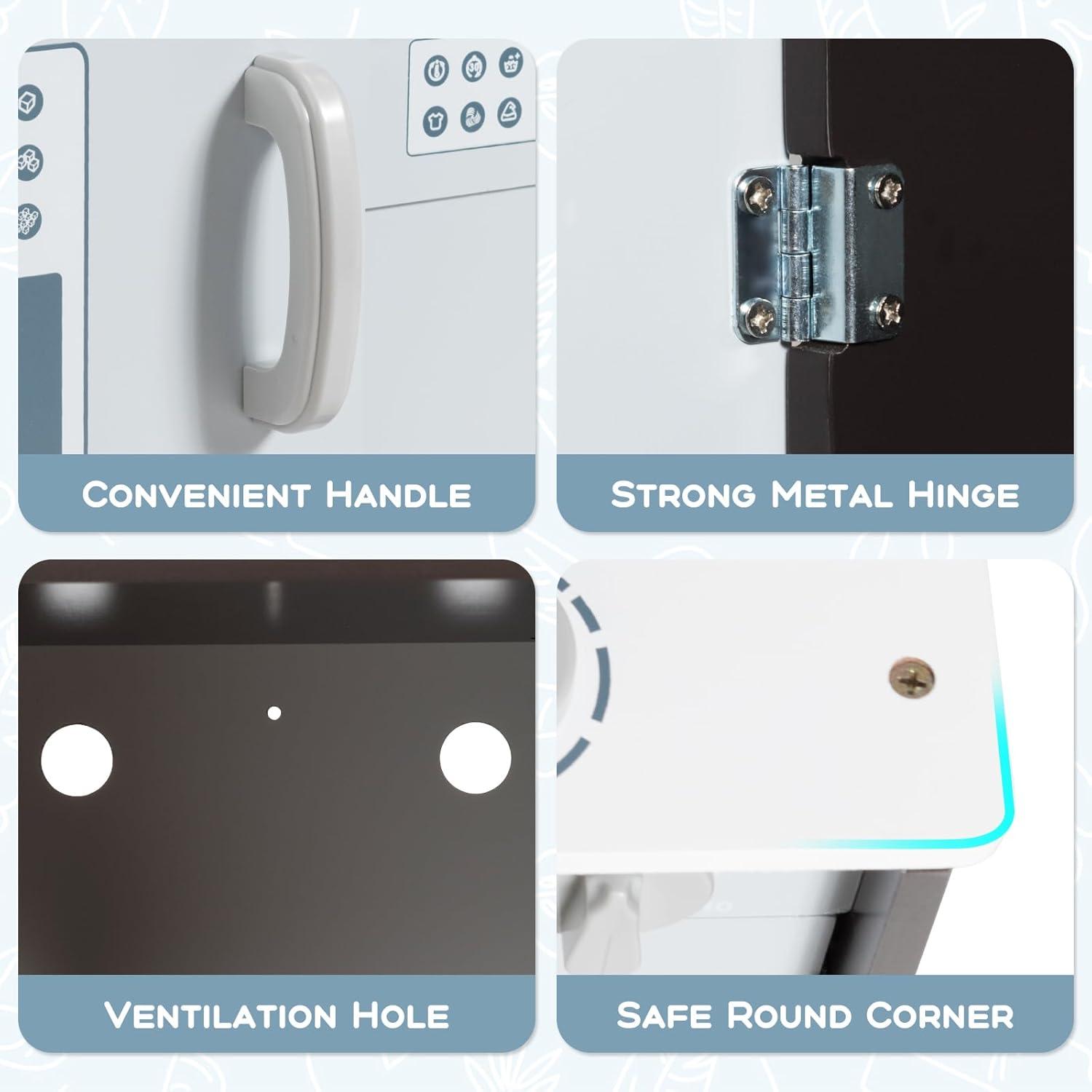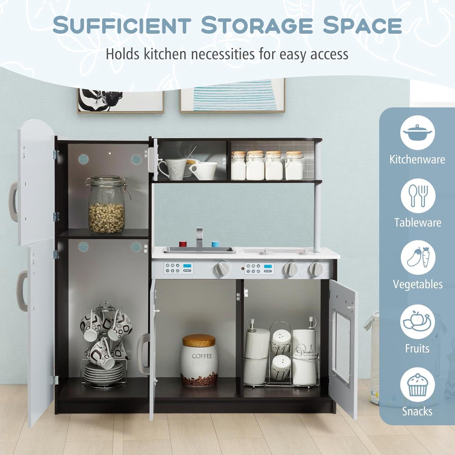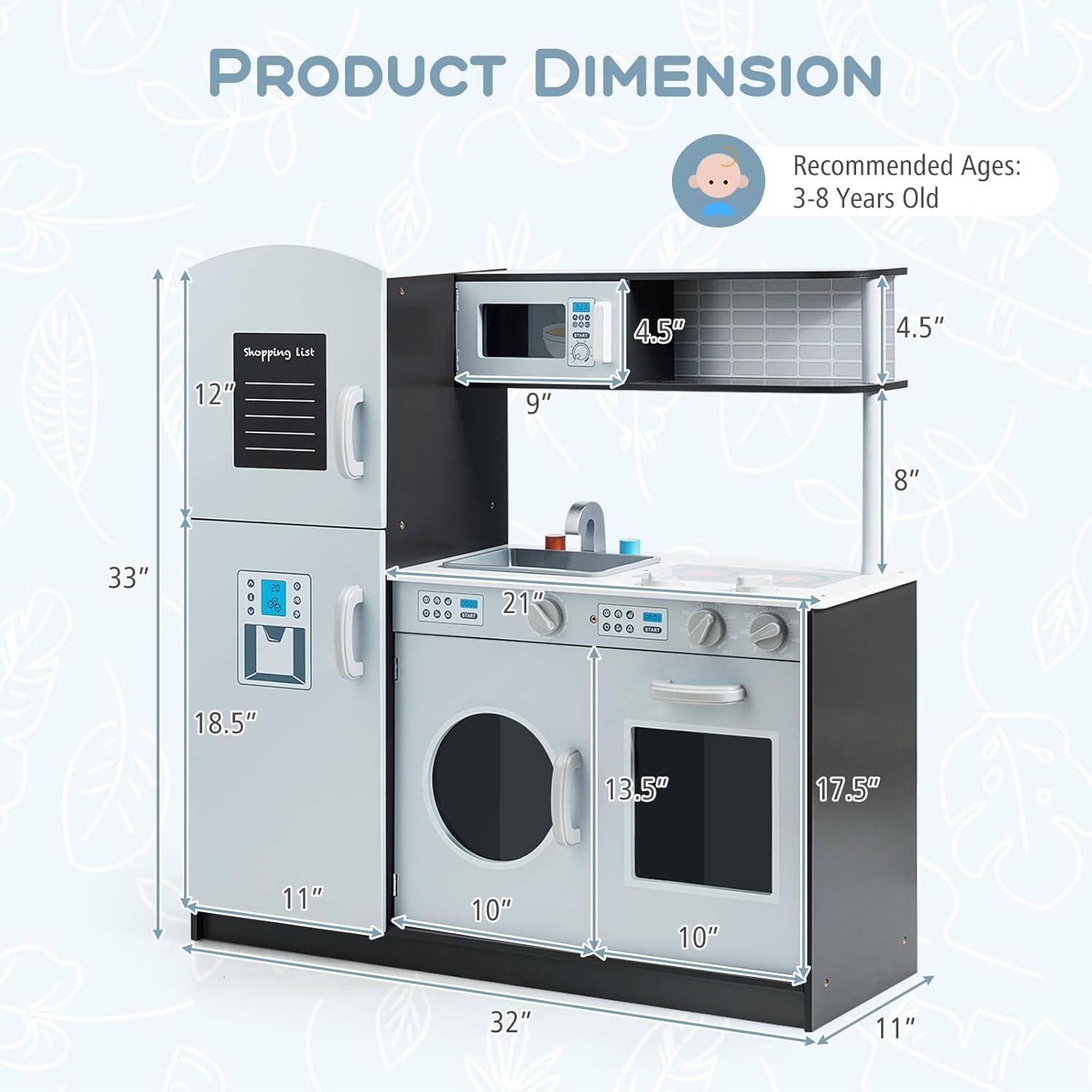 This children's toy kitchen set includes all kitchen facilities such as realistic stove, refrigerator, microwave, washing machine, faucet and removable sink, etc., and equipped with sound effects, which highly reproduces the real-life scenes, letting children experience the fun of cooking while exercising their hands-on ability, coordination and social skills. The kitchen play set is made of P2 MDF material, avoiding sharp edges and fragile parts to ensure kids' safety. Compact and exquisite size, can be easily integrated into a variety of family scenes, able to match with a variety of games to enhance the play experience.