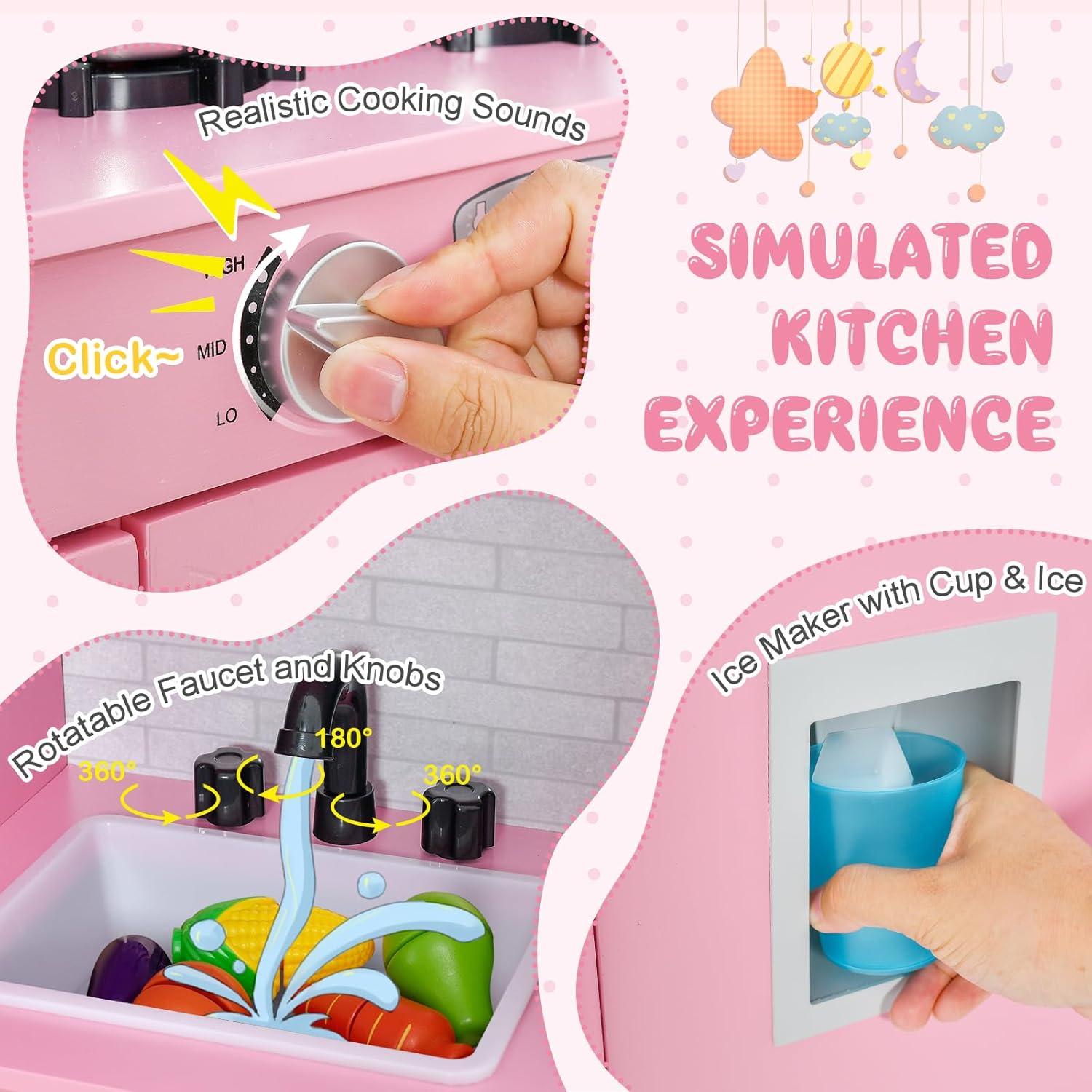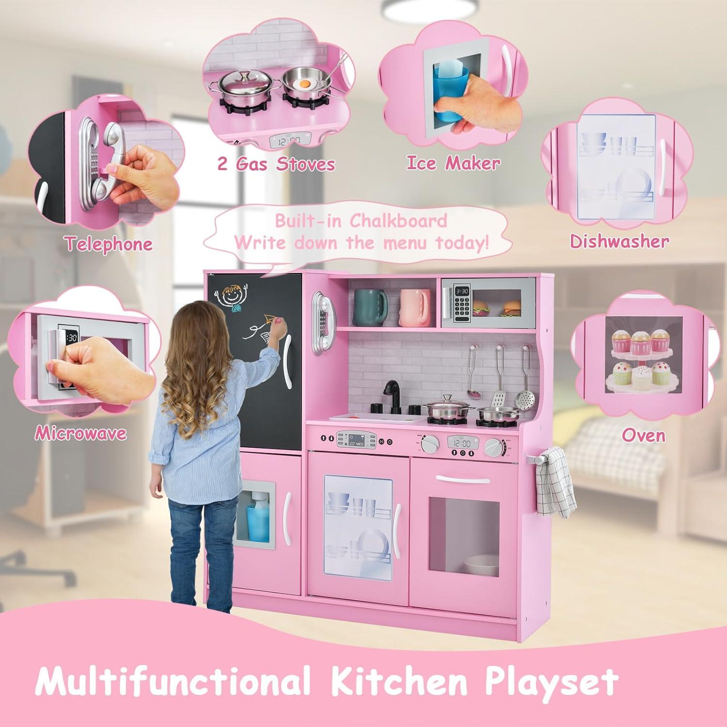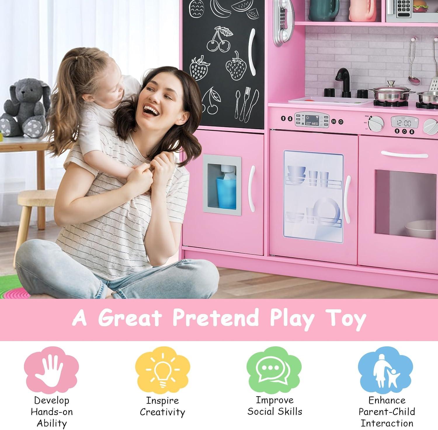 Standing out for its realistic cooking experience, this kids' kitchen playset comes with a full set of cooking accessories, including an ice maker, crock pot, frying pan, and simulated faucets and knobs, so kids can immerse themselves in simulated real cooking fun. Of particular note, it comes with a chalkboard on which kids can scribble and draw freely. The kitchen toy is crafted from high-quality wood, it has also passed the ASTM and CPSIA international safety certifications to ensure that children are safe and worry-free while playing. Designed with 6 storage compartments, it meets kids' storage needs while guiding them to learn to sort and organize. By pretending to be chefs, kids can exercise their hands-on skills, coordination and social skills while interacting with their friends, as well as stimulate their creativity and imagination, laying a solid foundation for their all-round development.