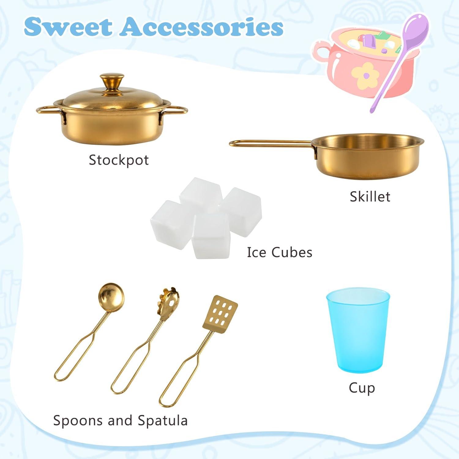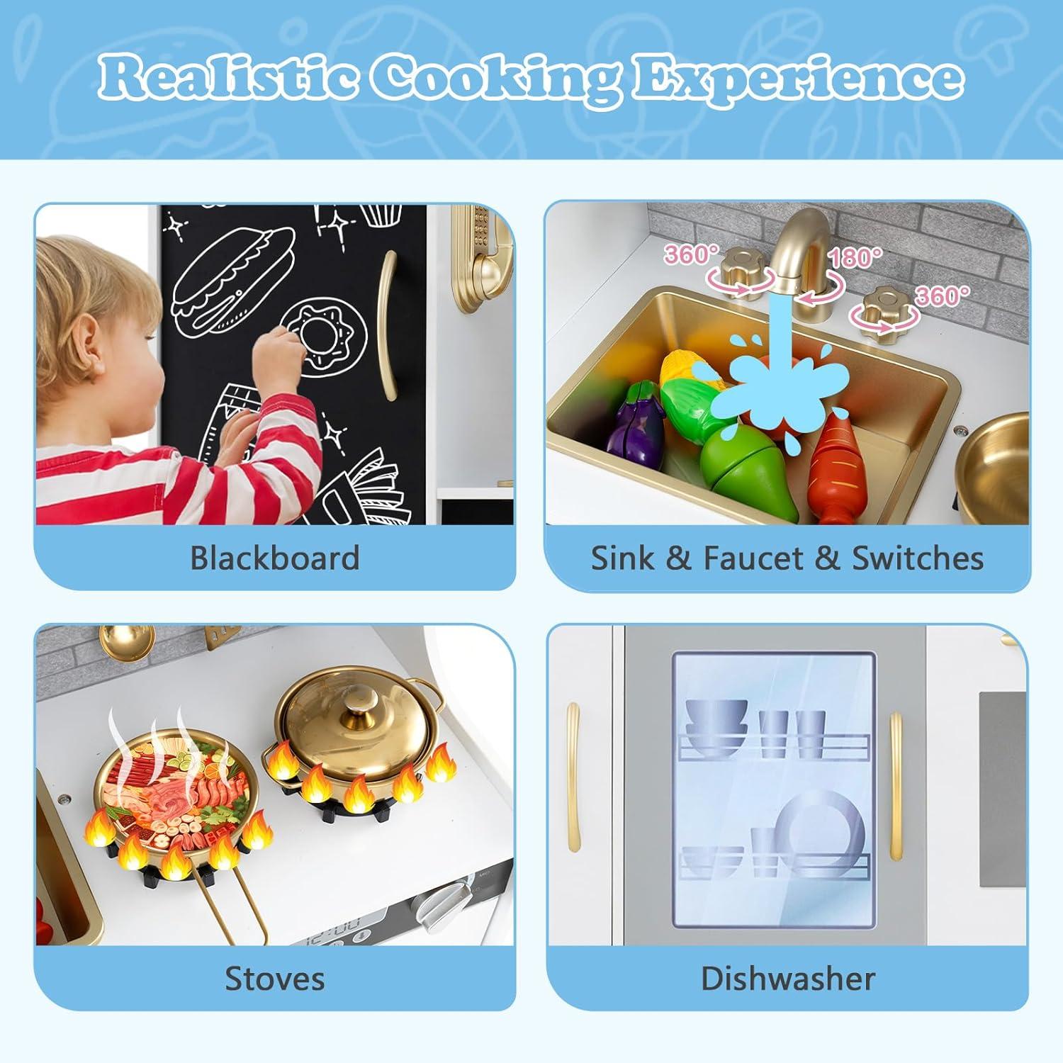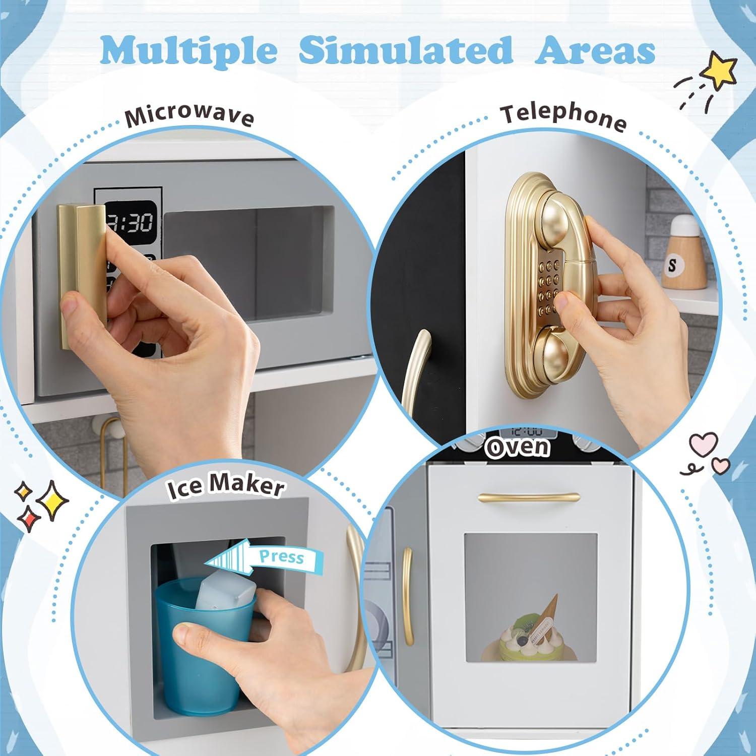 Realistic Kitchen Experience: This kids' kitchen play set comes with a full range of cooking accessories, such as ice maker, saucepan, wok, as well as simulated faucets and knobs, so that kids can simulate the real cooking process and experience the fun of cooking.