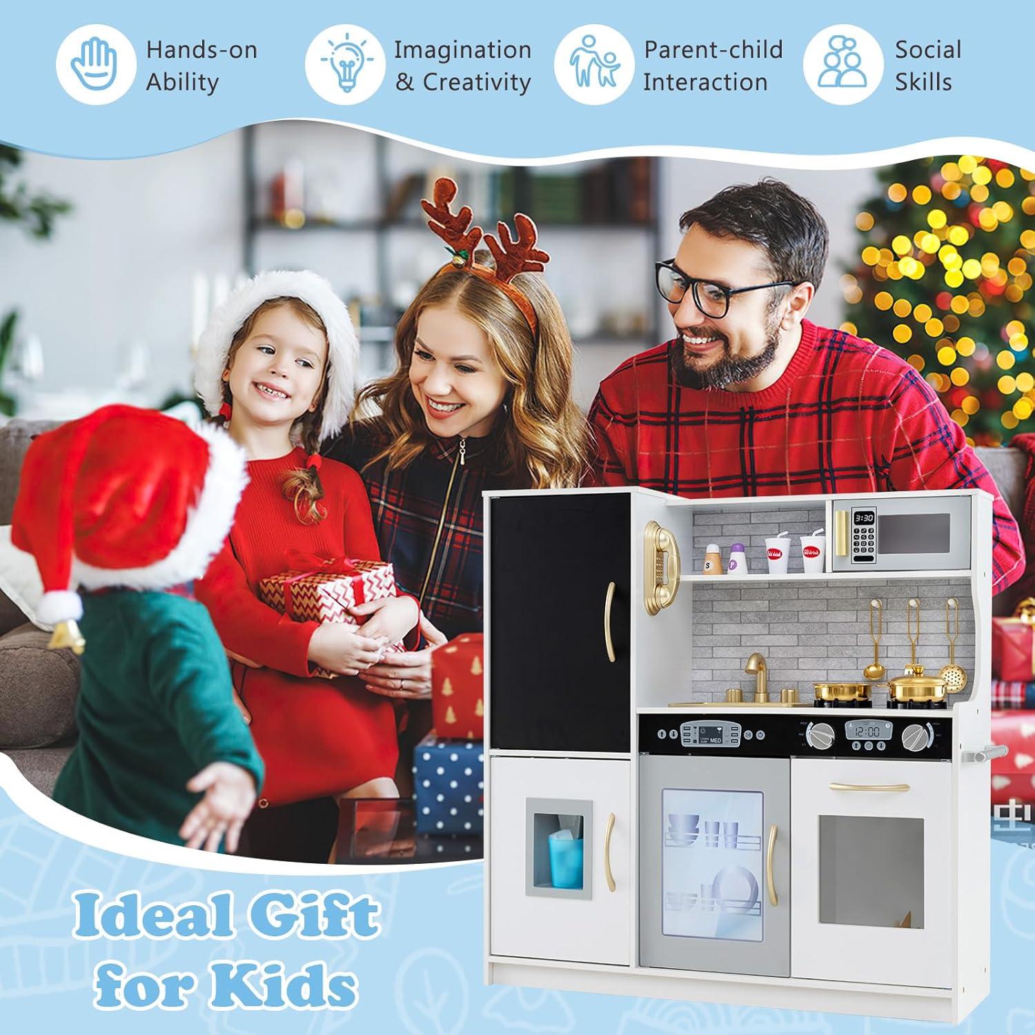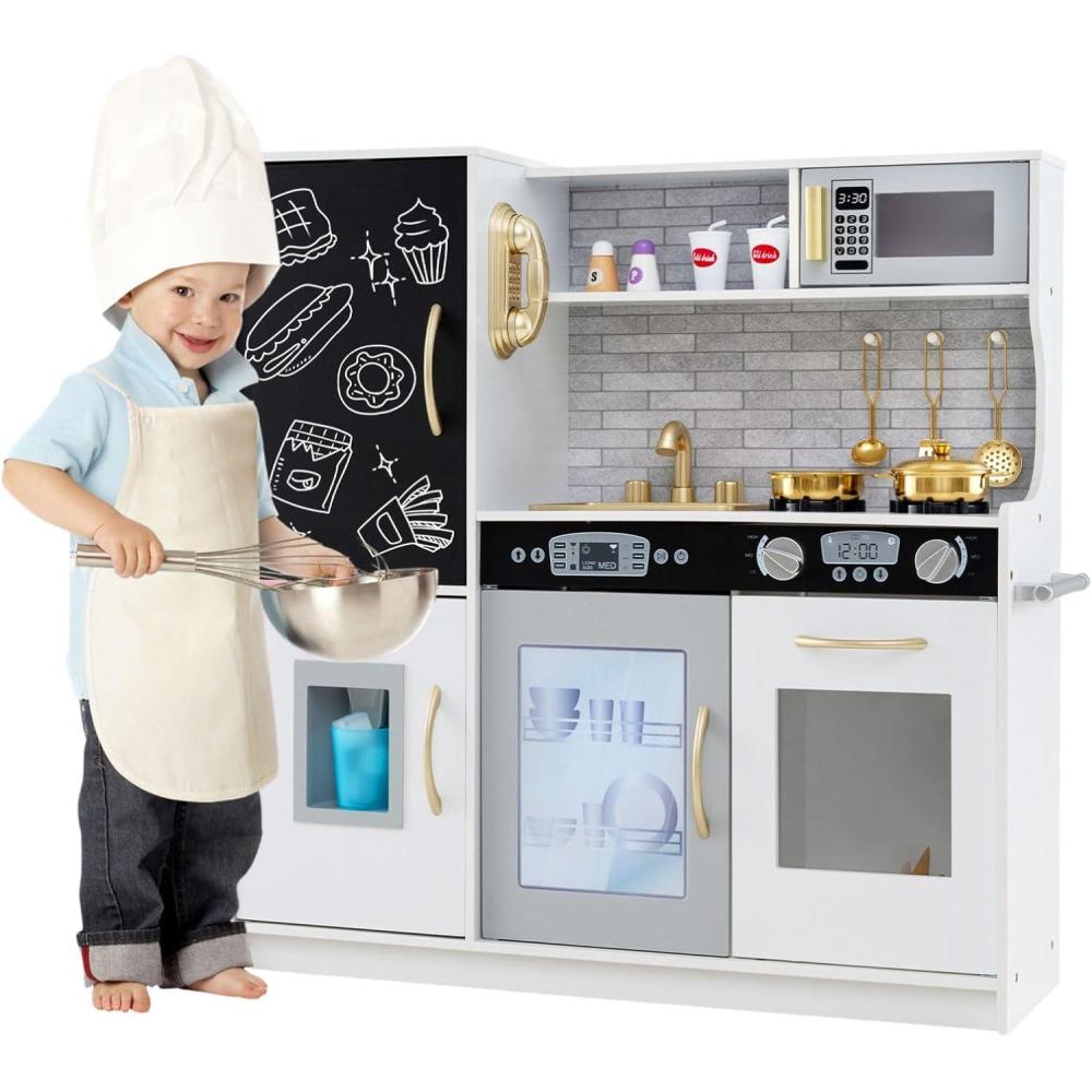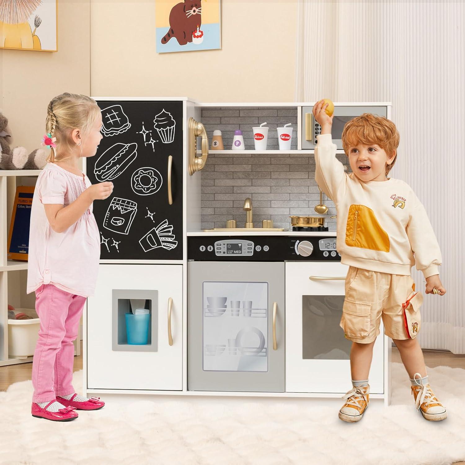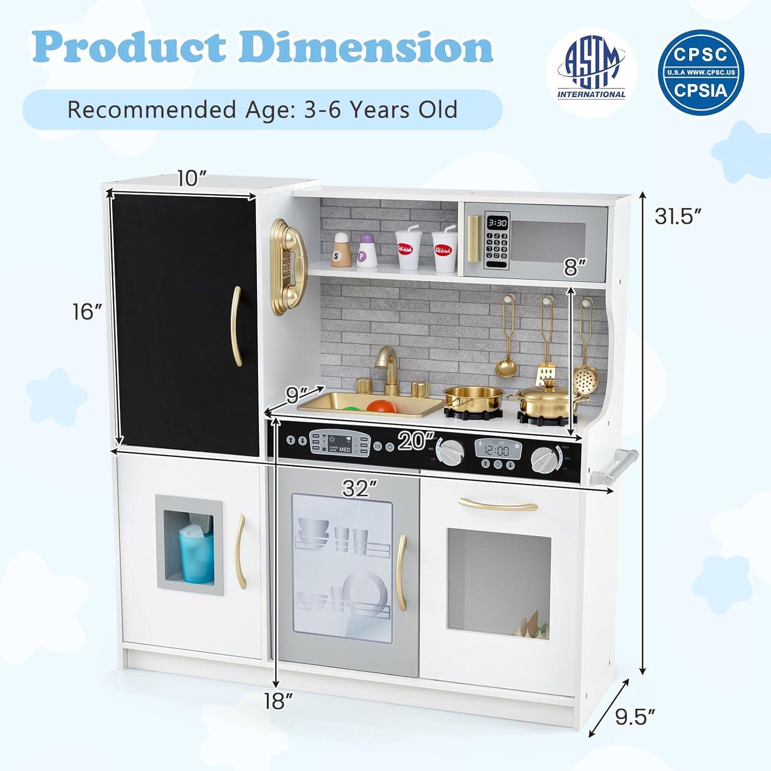 Standing out for its realistic cooking experience, this kids' kitchen playset comes with a full set of cooking accessories, including an ice maker, crock pot, frying pan, and simulated faucets and knobs, so kids can immerse themselves in simulated real cooking fun. Of particular note, it comes with a chalkboard on which kids can scribble and draw freely. The kitchen toy is crafted from high-quality wood, it has also passed the ASTM and CPSIA international safety certifications to ensure that children are safe and worry-free while playing. Designed with 6 storage compartments, it meets kids' storage needs while guiding them to learn to sort and organize. By pretending to be chefs, kids can exercise their hands-on skills, coordination and social skills while interacting with their friends, as well as stimulate their creativity and imagination, laying a solid foundation for their all-round development.