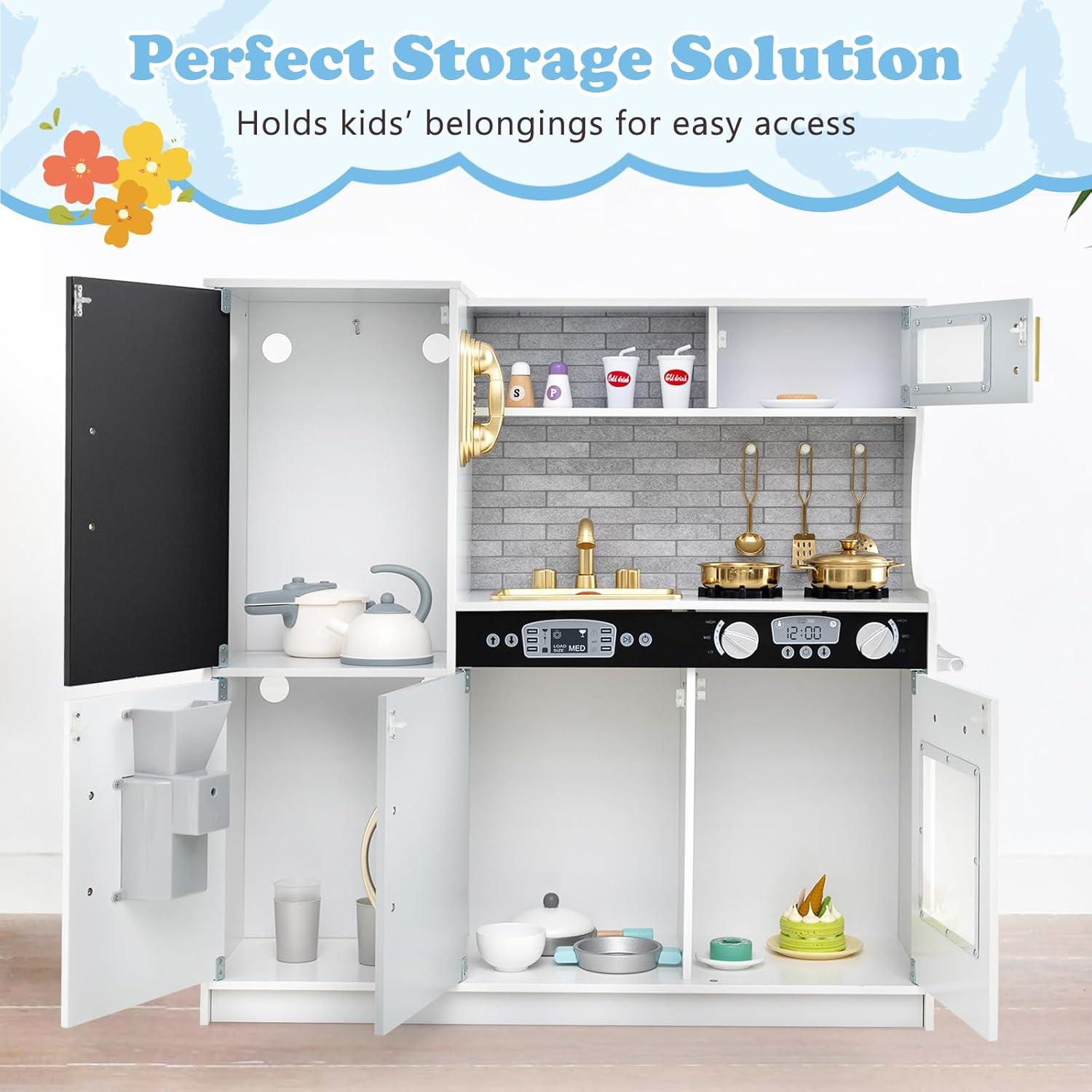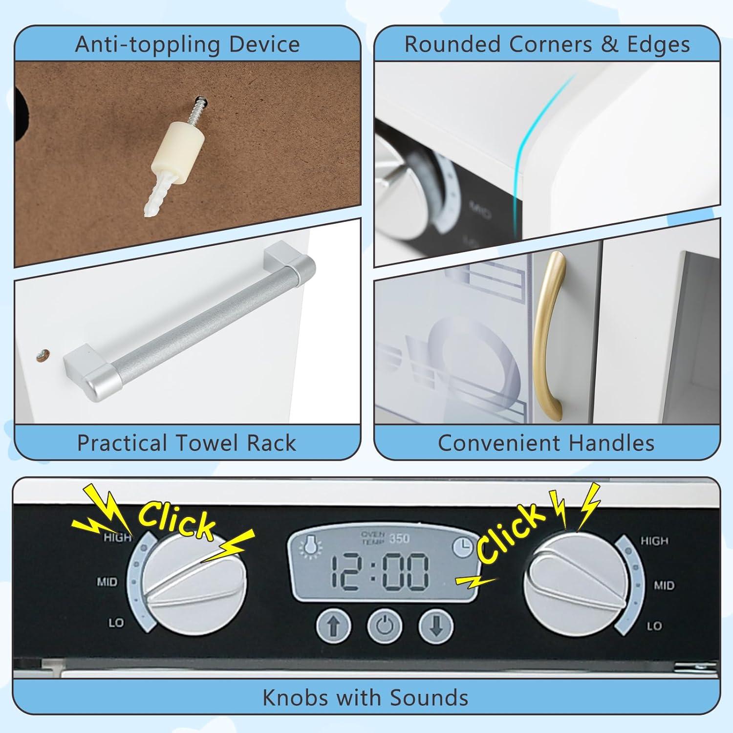 Huge Storage Space: The kitchen toys are designed with 6 storage compartments, 5 of which come with door panels to accommodate various cooking accessories and toy ingredients. This not only meets kids storage needs, but also allows them to learn to categorize and organize.