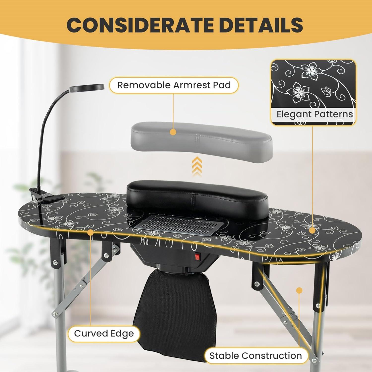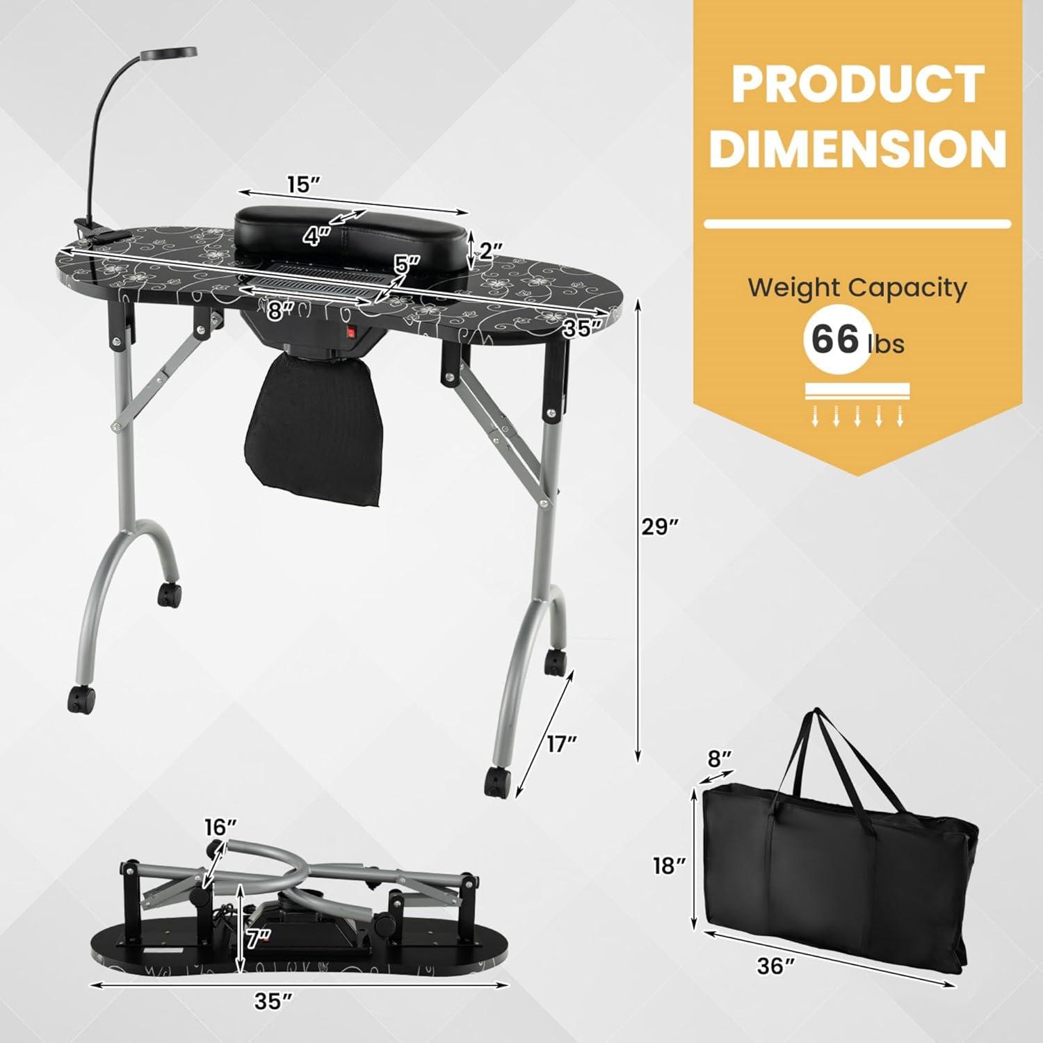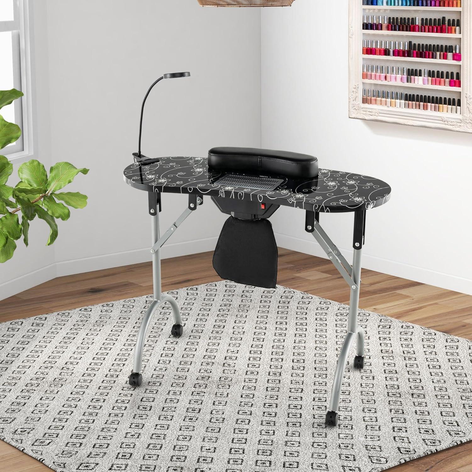 imagePortable Manicure Table Foldable Nail Desk wElectric Residue Collector Bendable LED Lamp Removable Armrest Pad Lockable Wheels Foldable Nail Table wCarry Bag for Home Salon WhiteBlack
