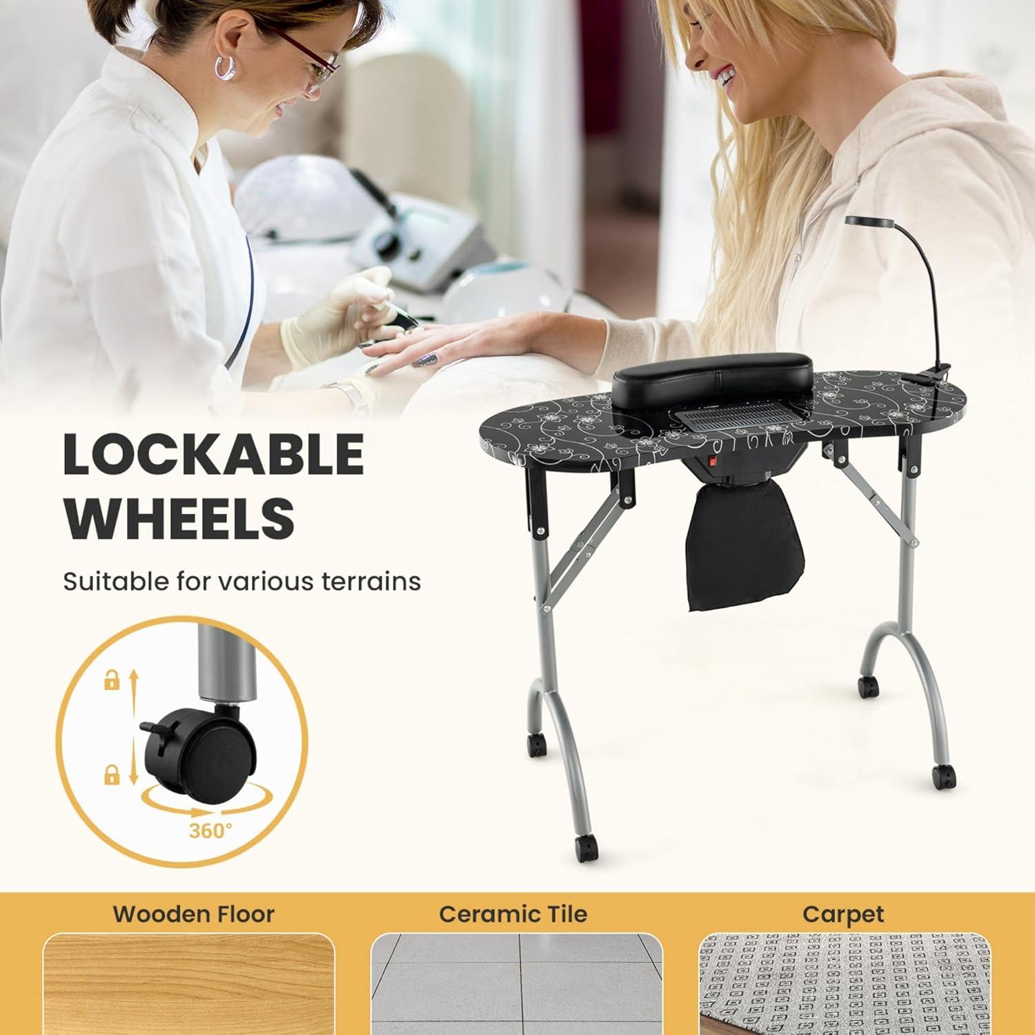 Lockable Smooth-Glide Wheels: The foldable manicure table's 4 lockable wheels provide easy mobility and stability, allowing you to position the table perfectly and keep it securely in place during use