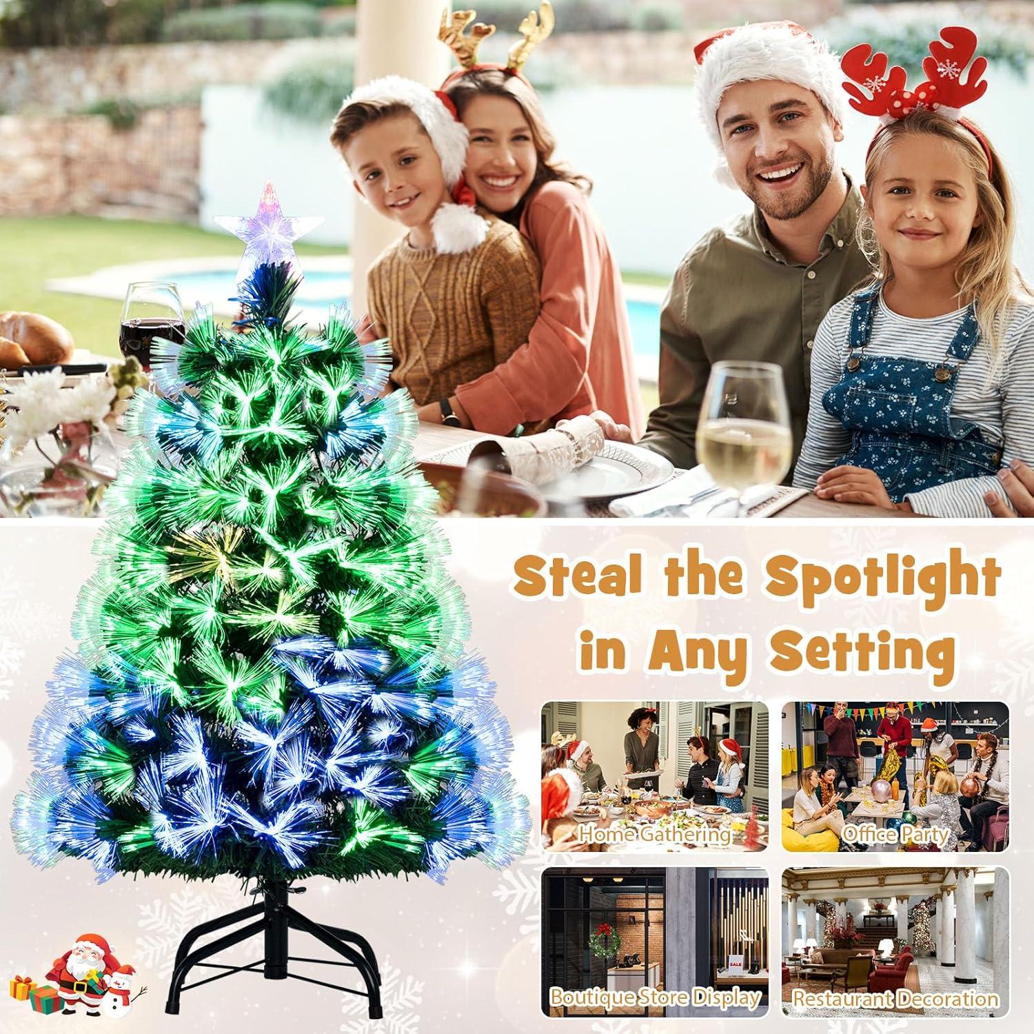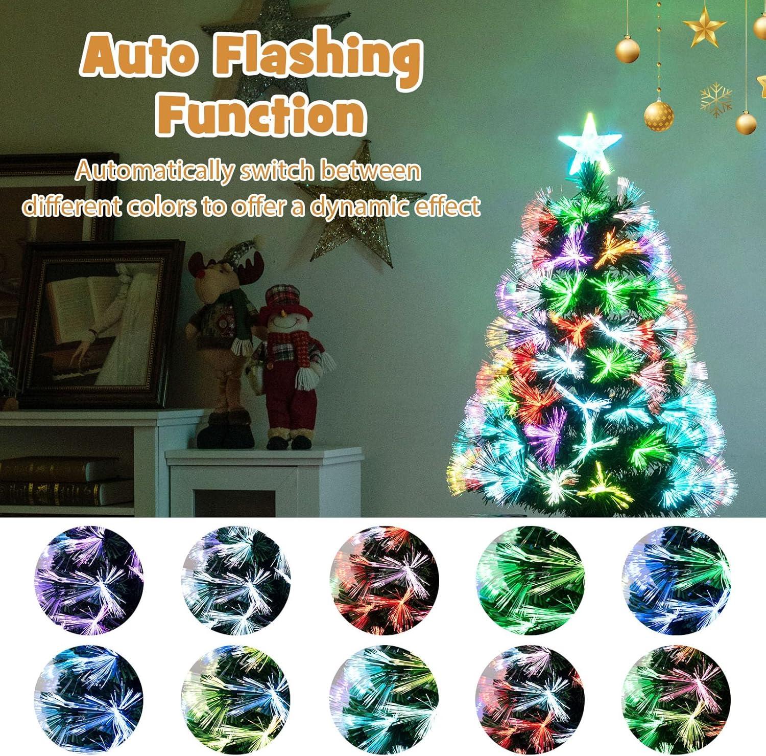 Safe Pre-lit Design for Family-friendly Use: This 3ft fiber optic Christmas tree adopts non-allergenic premium PVC material and a reliable adaptor paired with soft auto flashing multi-color lights making it a safe lighted holiday decoration suitable for families with kids and pets bringing worry-free festive ambiance to your home party.