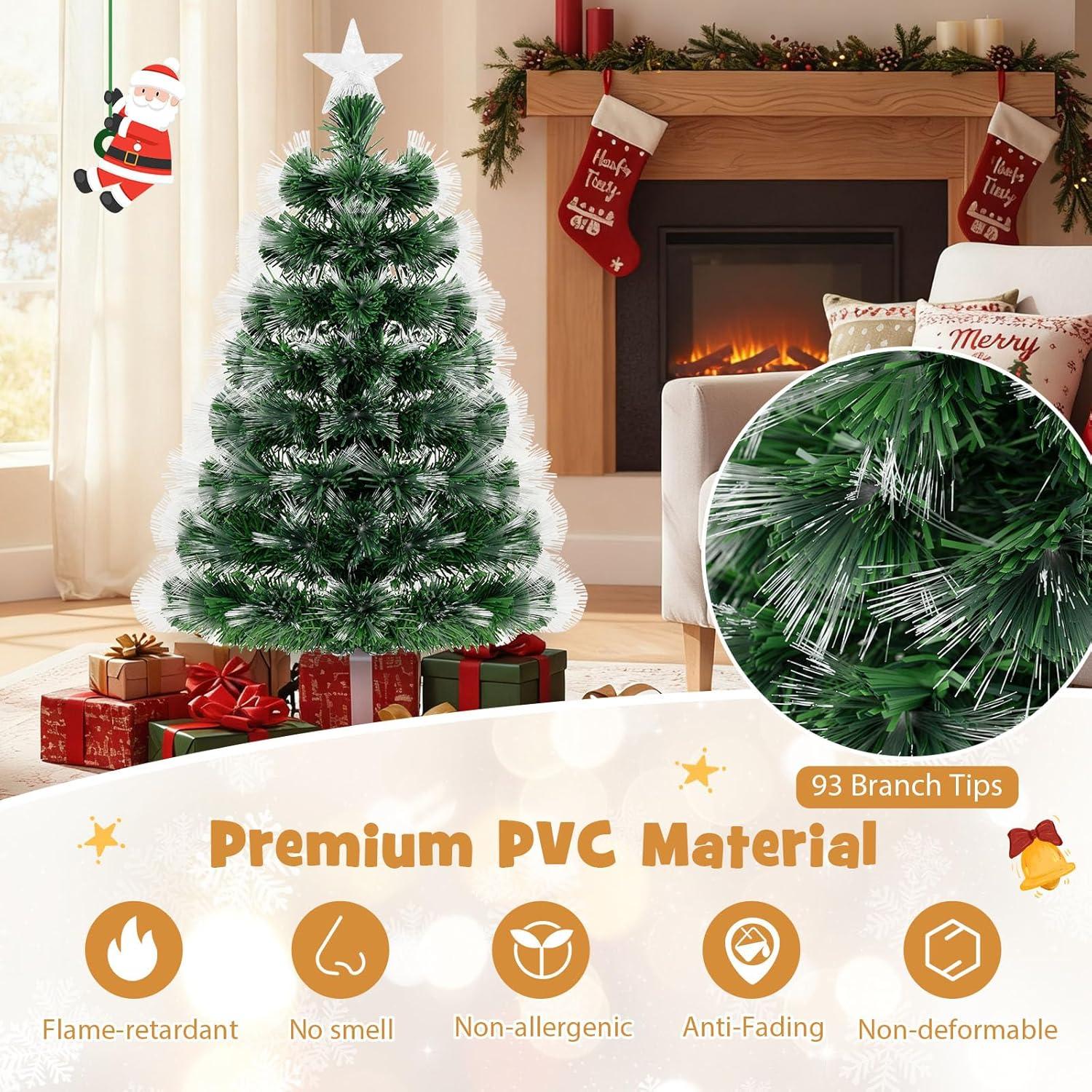 Adorned with 93 lush branch tips, it features auto flashing multi-color fiber optics and a sparkling top star, paired with a reliable adaptor for safe use. Crafted from premium PVC and metal, this fireproof Christmas tree is anti-fading, low-maintenance, and built to last. The folding metal stand ensures easy setup and stability, while its compact size makes it a space-saving Xmas tree perfect for homes, offices, parties, or shops. This multi-scene universal holiday decoration piece blends charm and practicality, ideal for spreading holiday joy in any small indoor space!