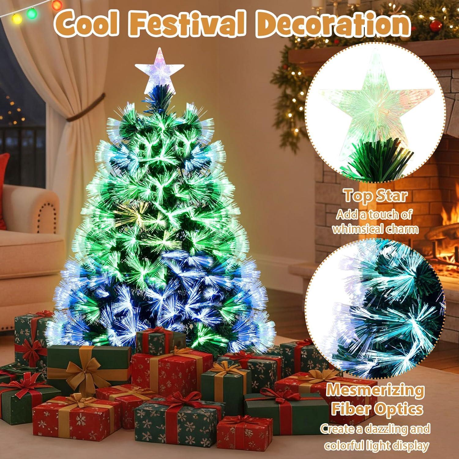 Charming Top Star Enhance Festive Vibe: The artificial Xmas tree is adorned with a sparkling top star and embedded multi-color fiber optics, which auto flash to create a mesmerizing light effect, adding a magical touch to the holiday decoration and making it a standout pre-lit Christmas tree for indoor celebrations.