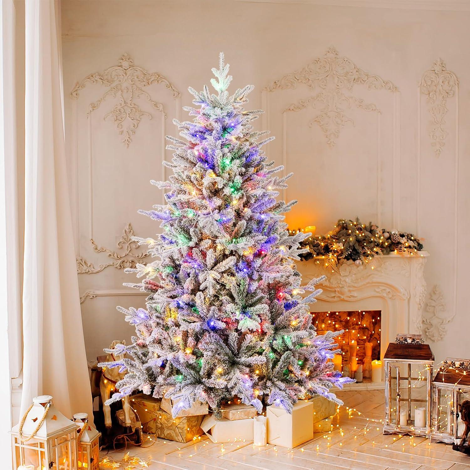 imagePreLit Flocked Christmas Tree 6FT Hinged Artificial Xmas Tree with 8 Lighting Modes MultiColor LED Lights PVC ampamp PE Vivid Branch Tips Festival Decoration Tree for Home 6FT45FT