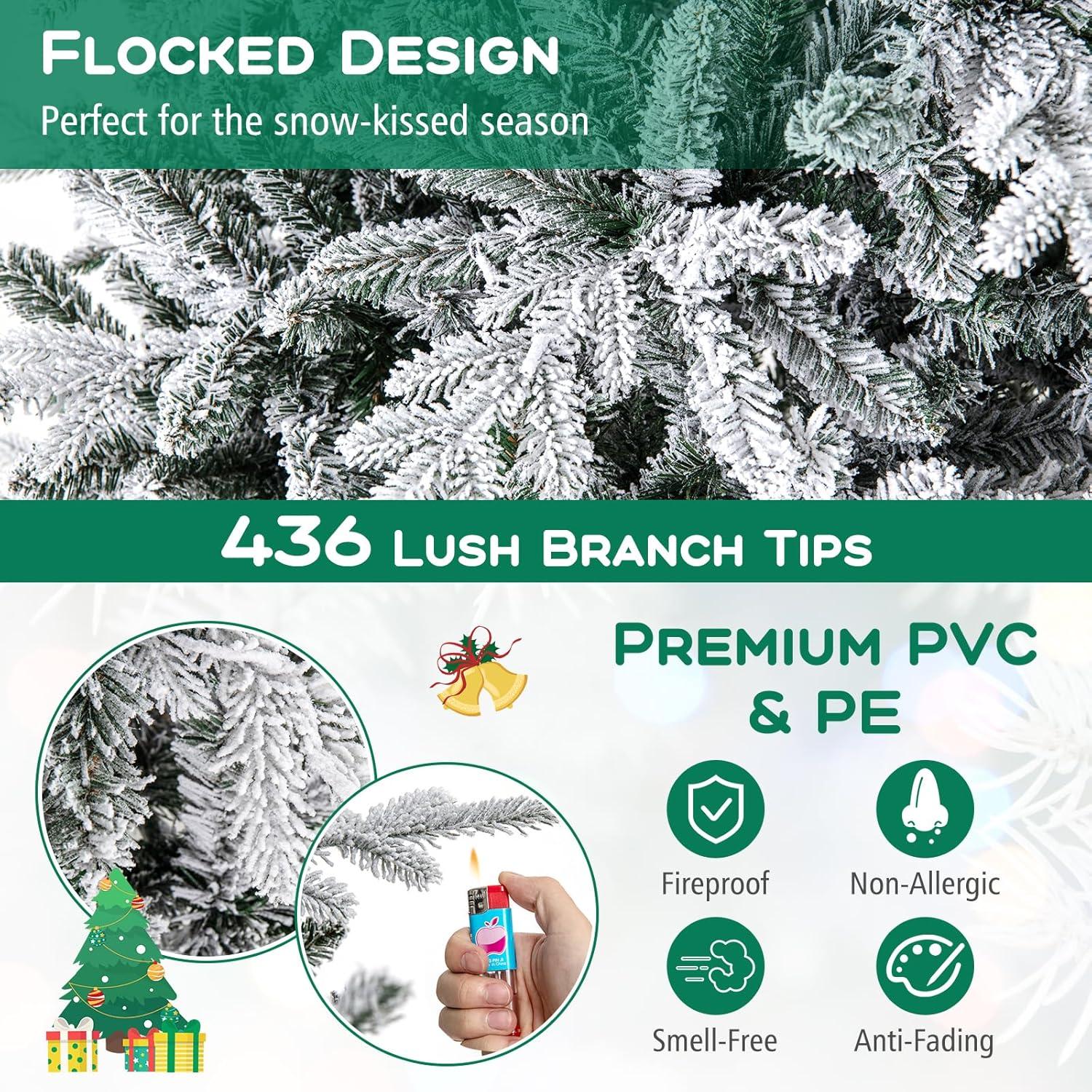 Our artificial Christmas tree features an impressive lush branch tips crafted from a blend of PVC and PE foliage, elegantly draped in thick flocked snow that exudes enchanting winter charm. This captivating display is sure to mesmerize everyone during the holiday season. What's more, the Xmas tree can illuminate your space with vibrant LED lights offering 8 dynamic lighting modes to suit any atmosphere you need. Designed with a practical hinged structure, the Christmas tree allows for you effortless assembly and quick disassembly. At the same time, constructed with flame-resistant & PVC materials, ensuring your safety and long-lasting durability. Perfect for various decorations and settings—from traditional Christmas celebrations to winter-themed weddings or parties—this Christmas tree adapts seamlessly to all your festive needs.