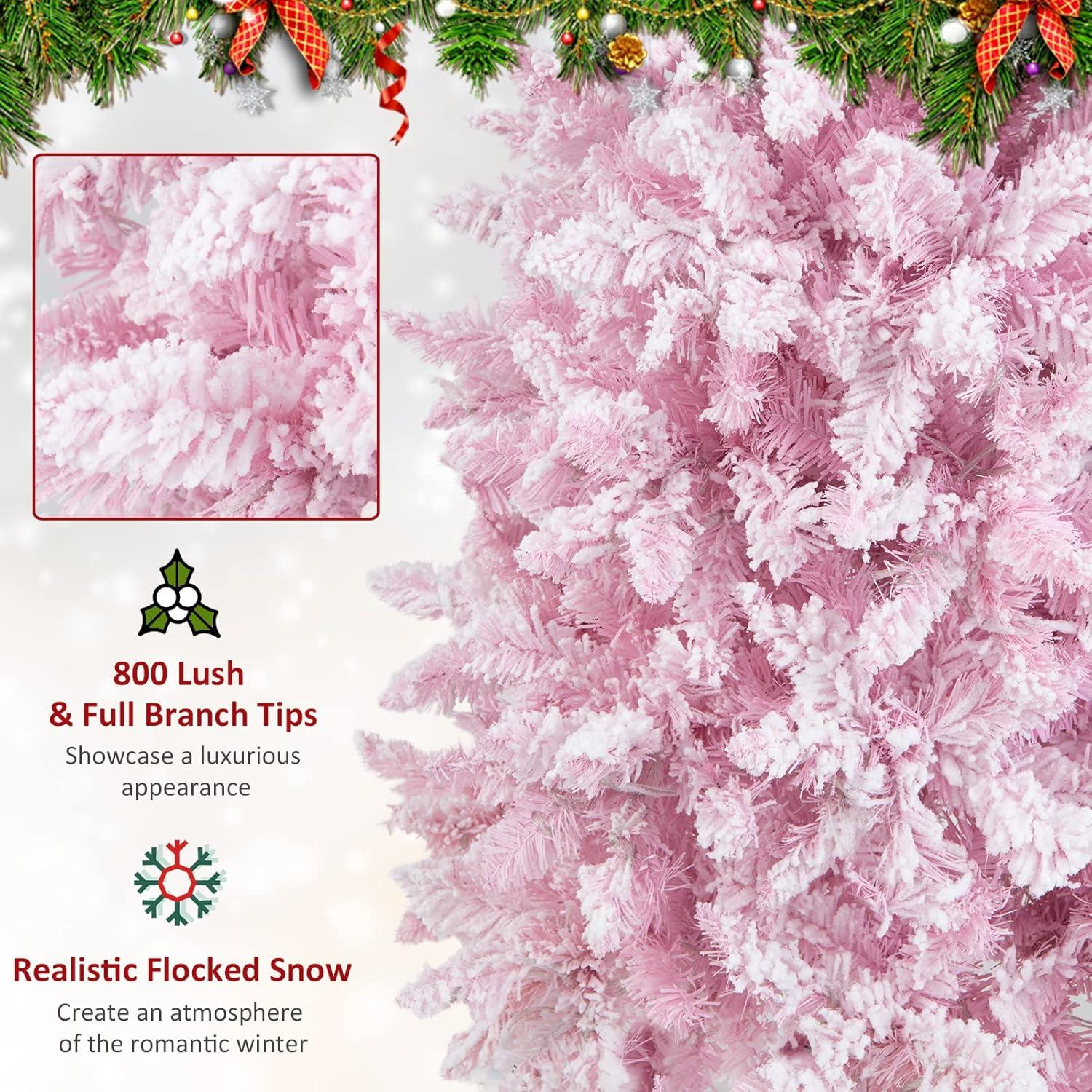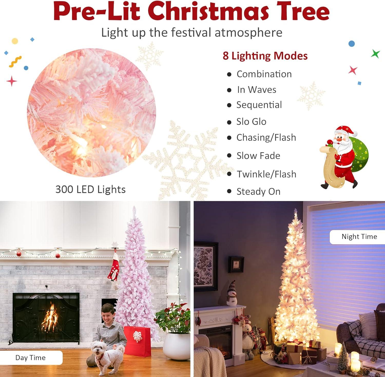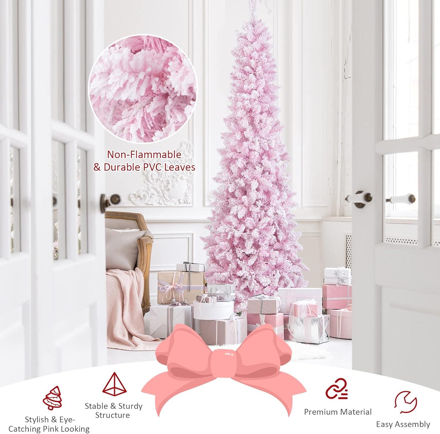 This 7ft Pink Pre-Lit Pencil Christmas Tree is your ideal pick for upgrading indoor holiday decoration! As a top-tier pre-lit artificial Christmas tree, it boasts a unique pink aesthetic and realistic snow flocking on dense PVC branch tips, mimicking a natural winter scene—perfect as an eye-catching centerpiece for your home, office, apartment, or classroom.