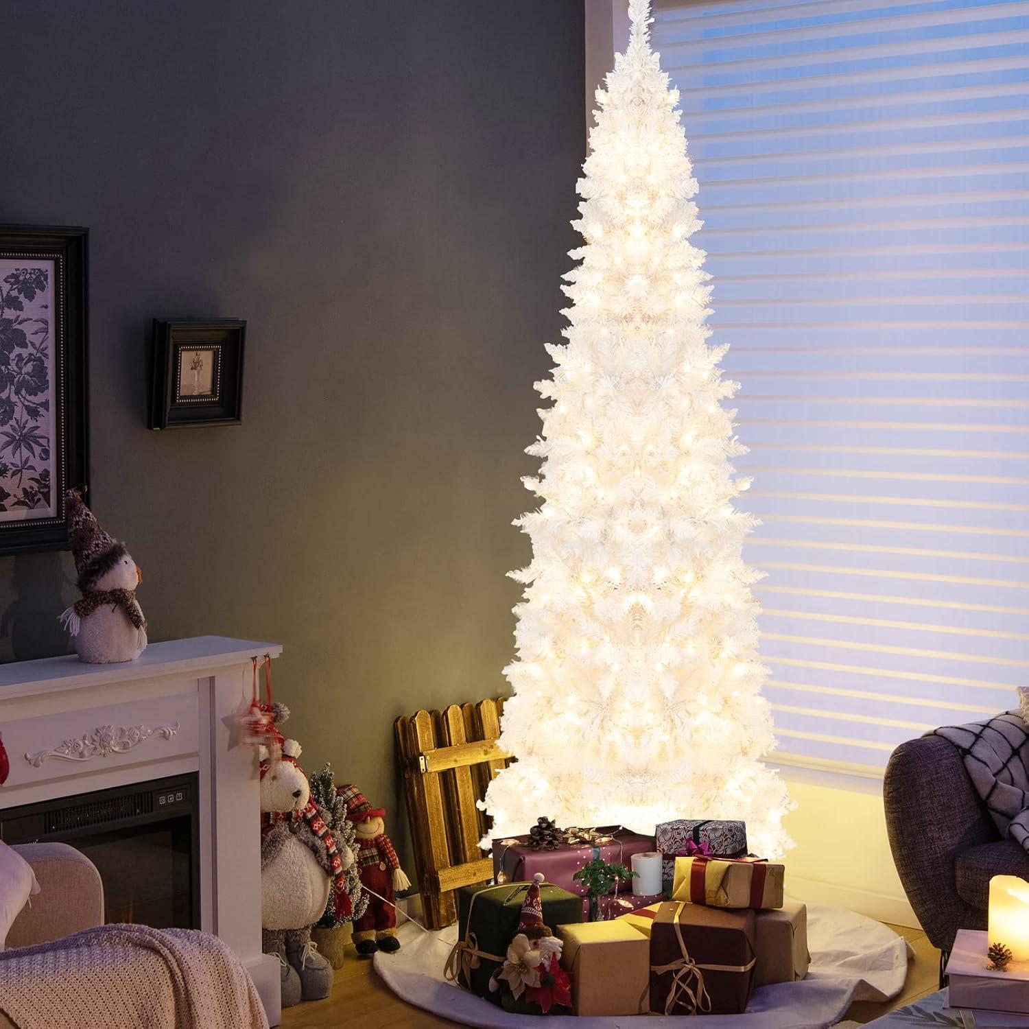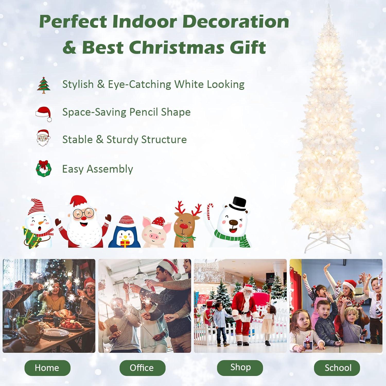 Pre-Lit Pencil Christmas Tree, Artificial Tree with Snow Flocked Branches Warm White LED 8 Lighting Modes, Holiday Decoration for Indoor Home Office (White)(White)