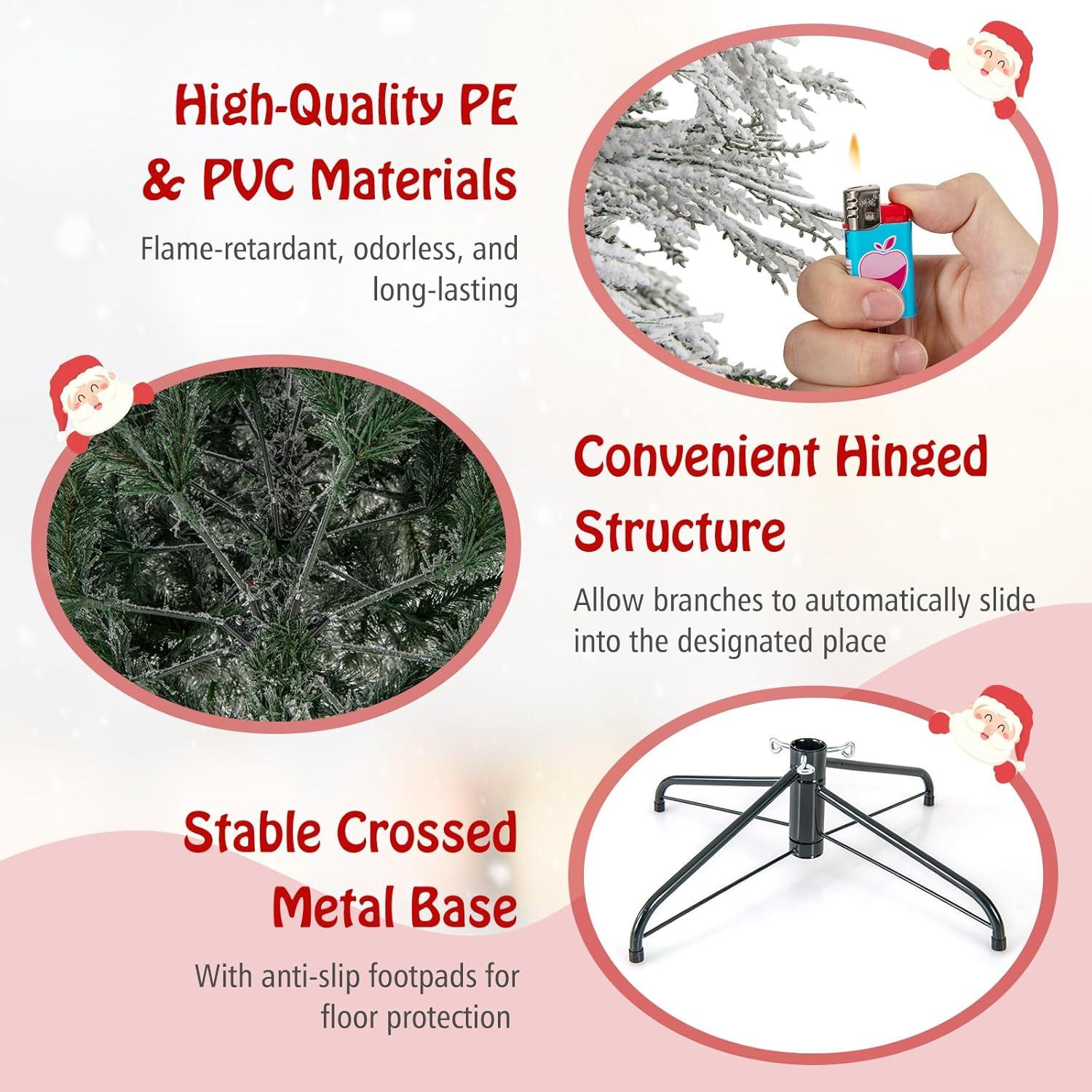 Artificial Christmas Tree, 7.5ft Snow Flocked Hinged Pine Tree with 1010 Branch Tips & 450 Warm LED Lights, Portable Metal Base, Perfect Xmas Decoration for Home Office Party (7.5ft)(6ft)