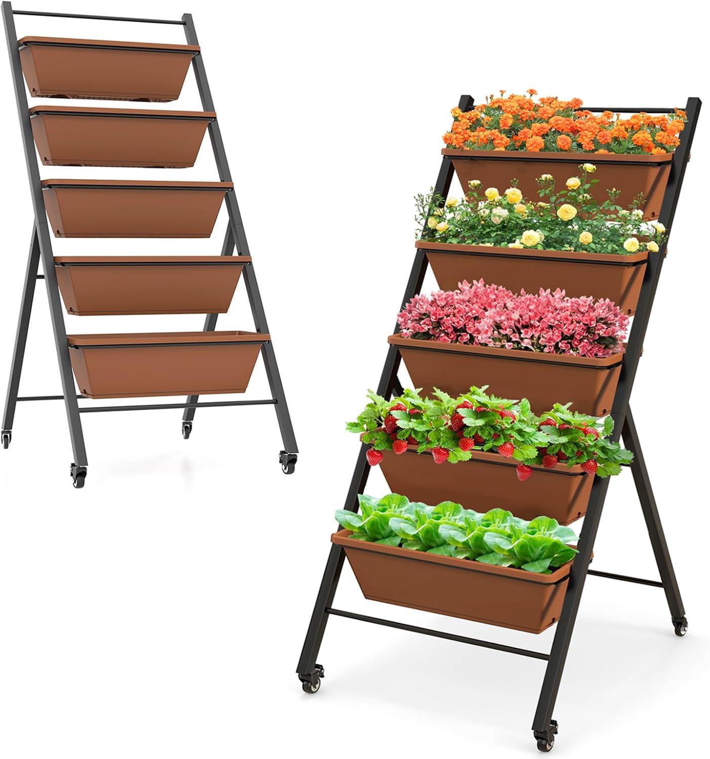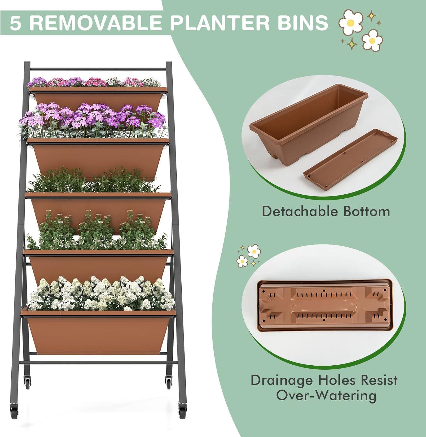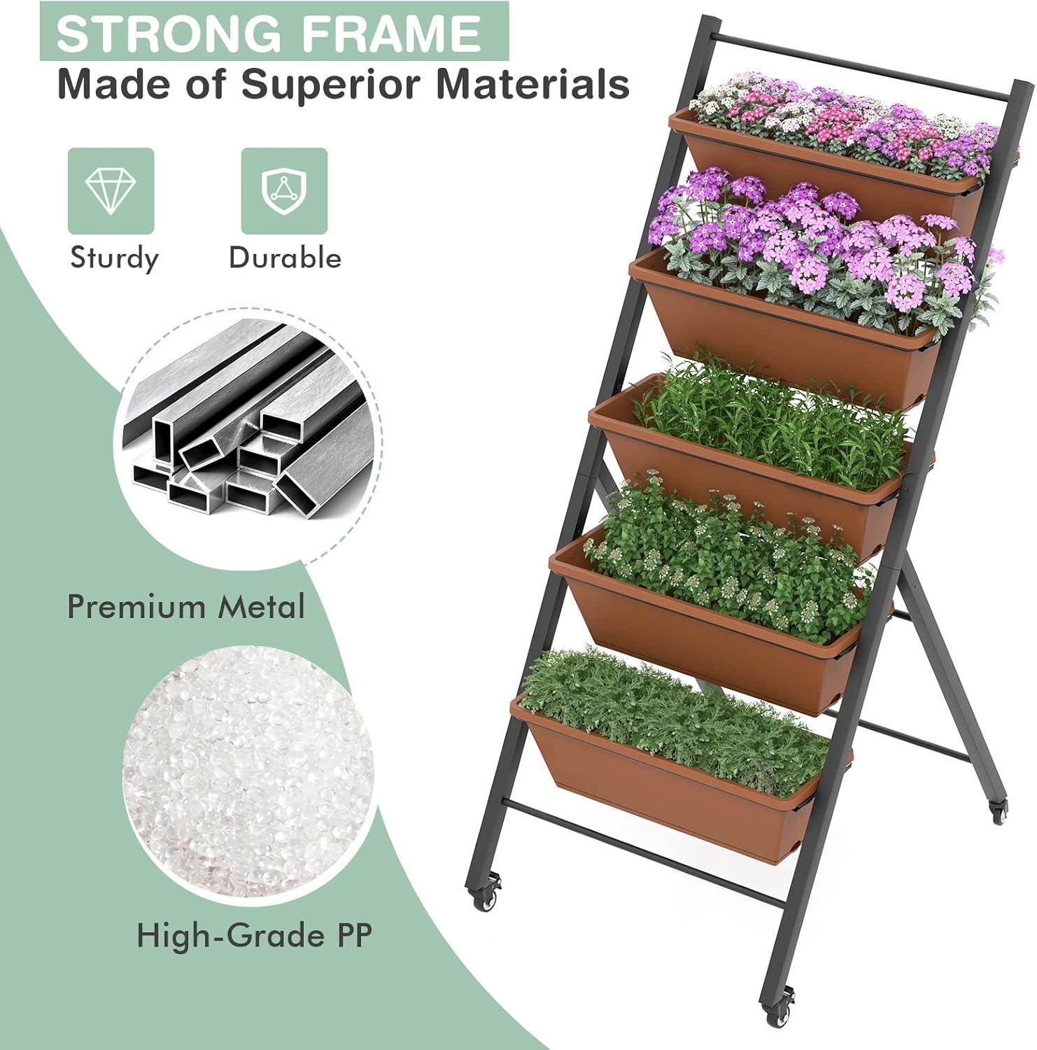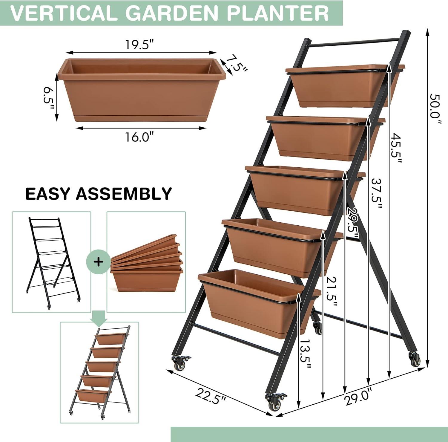 This raised garden bed is equipped with 5 removable planting boxes, which are arranged in a stepped layout to ensure even lighting for plants on each level. The planter boxes are made of ageing-resistant PP material with metal frame and triangular support structure. The surface is sprayed with rust-resistant paint to form a stable and lasting planting platform. The removable water tray can not only store water, but also quickly drain the water to prevent root rot. Equipped with 4 universal wheels (2 wheels with self-locking brakes) and shock-absorbing spring structure, it realizes flexible movement on all terrains. The snap-on assembly design supports 5 minute quick construction, and the 3D structure makes full use of vertical space, creating an efficient ecological planting system while saving ground area.
