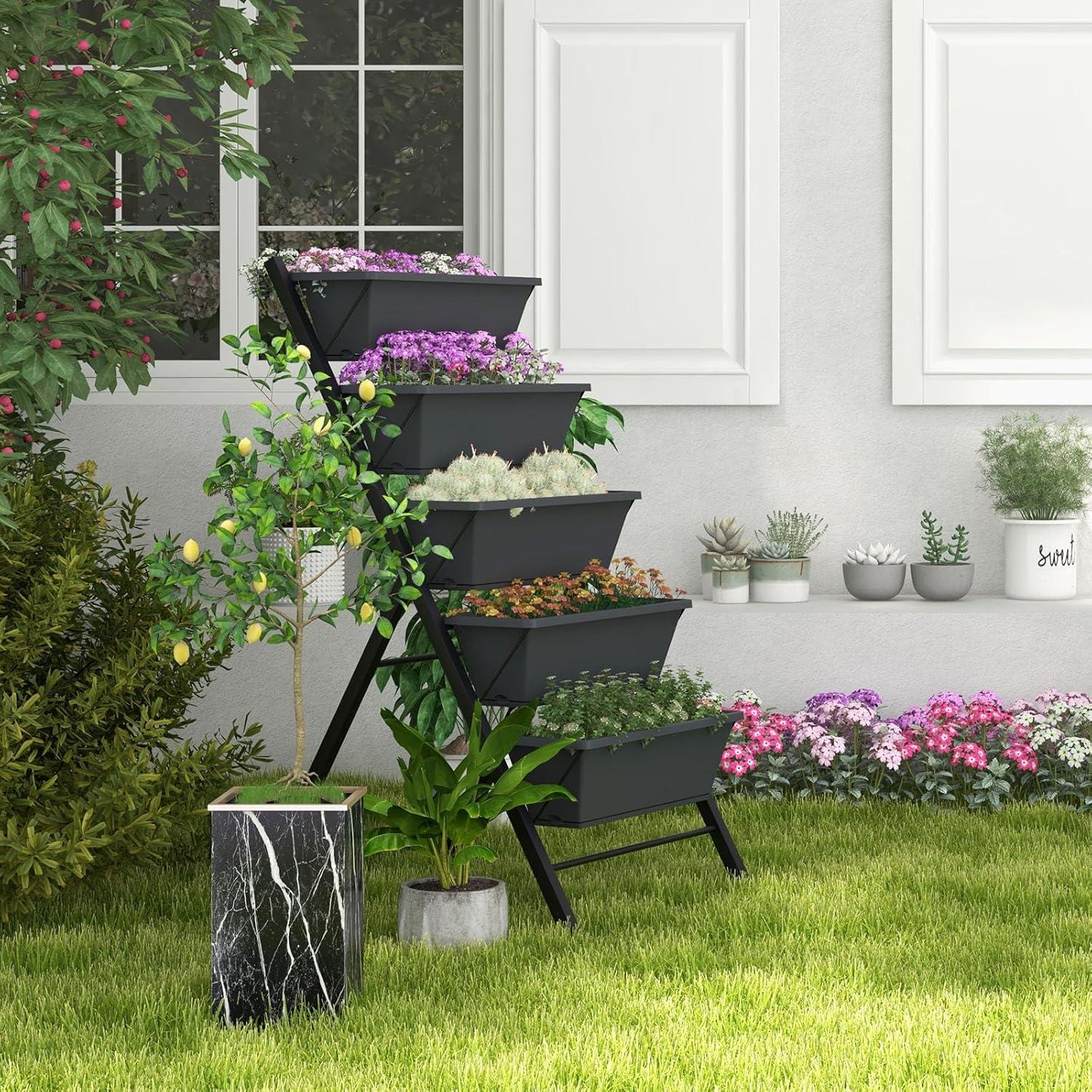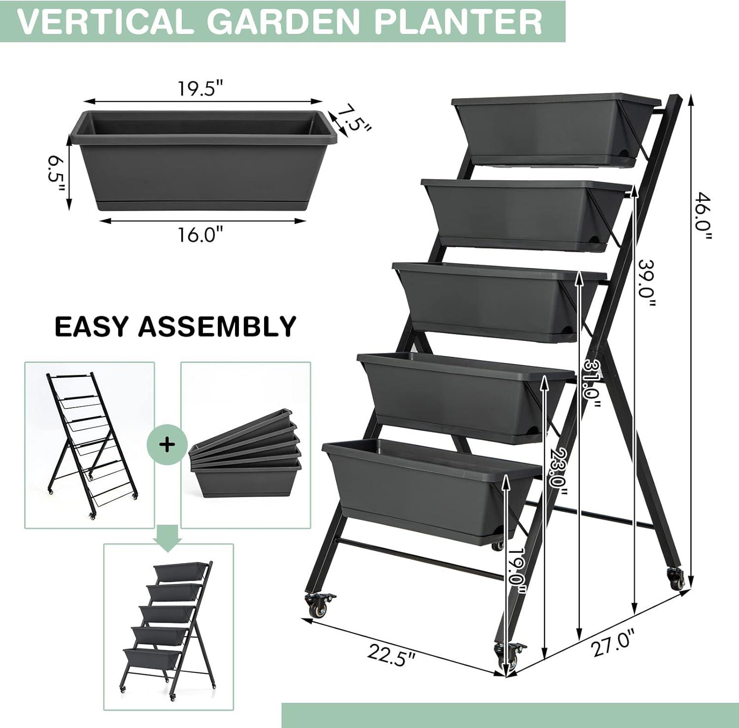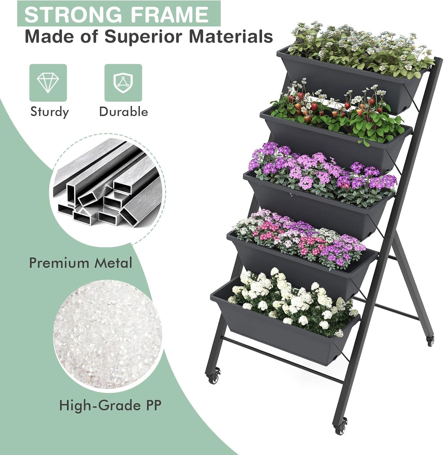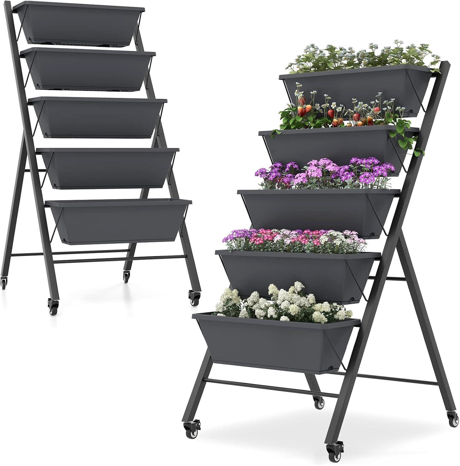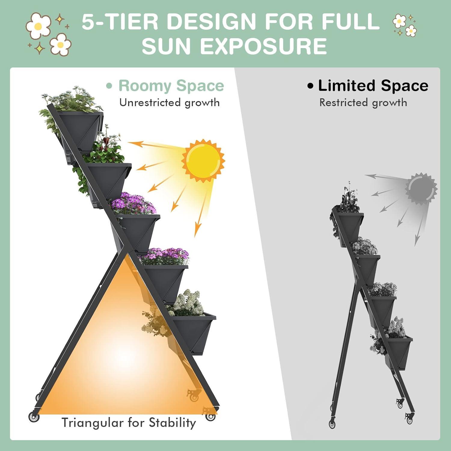 Raised Garden Bed on Wheels, 5-Tier Elevated Planter Box with Removable Base, Drainage Hole & Metal Frame, Outdoor Garden Planter Container for Flower Vegetables (1, Dark Grey)(Dark Grey)