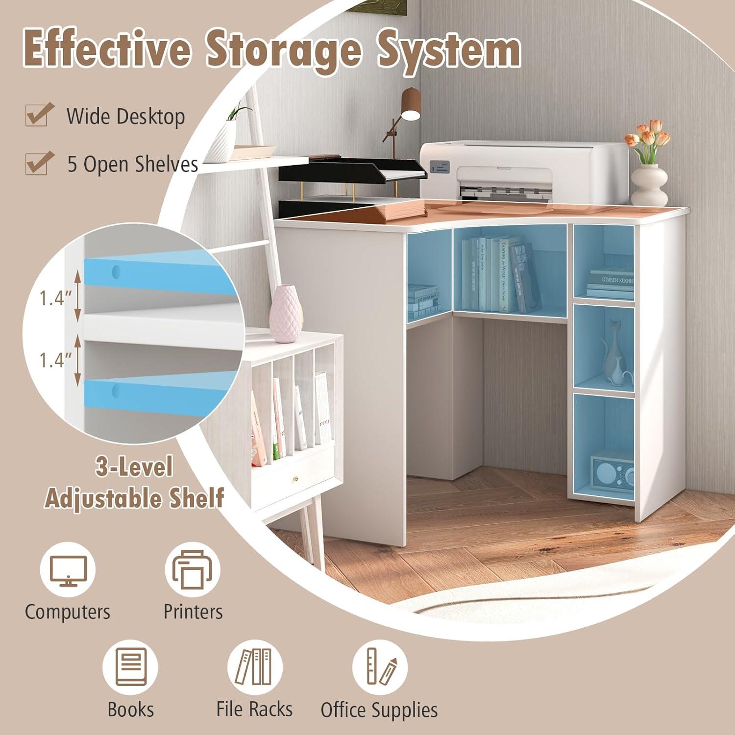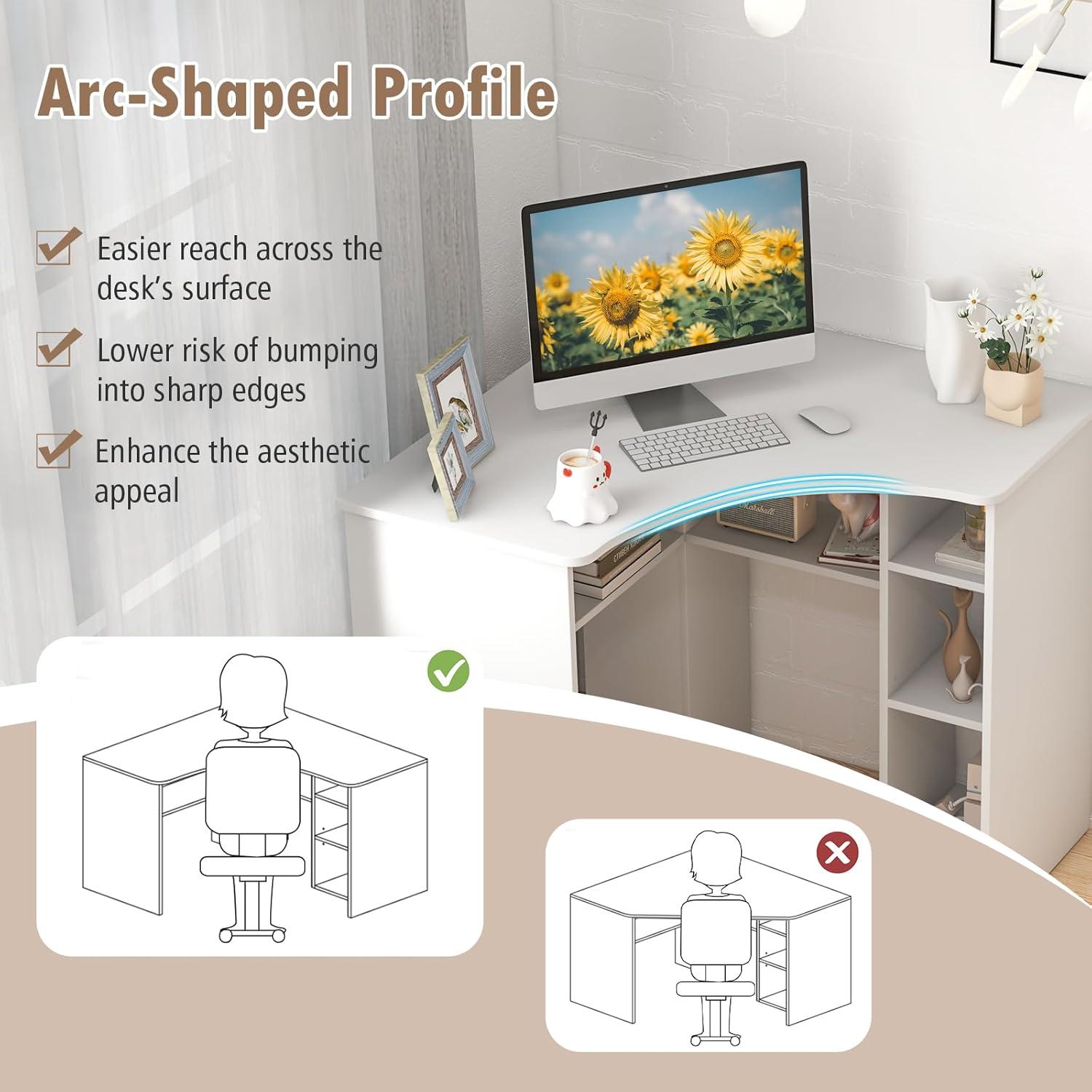 Working on this computer desk, you will feel comfortable for the arc shaped profile and ample leg space. Wide desktop and 5 open shelves gives you sufficient space to meet your different storage needs and helps you develop good habits of organizing and storing office supplies. Its sturdy structure can support up to 250 lbs. This cleverly designed corner desk can not only upgrade your space but also improve the productivity.