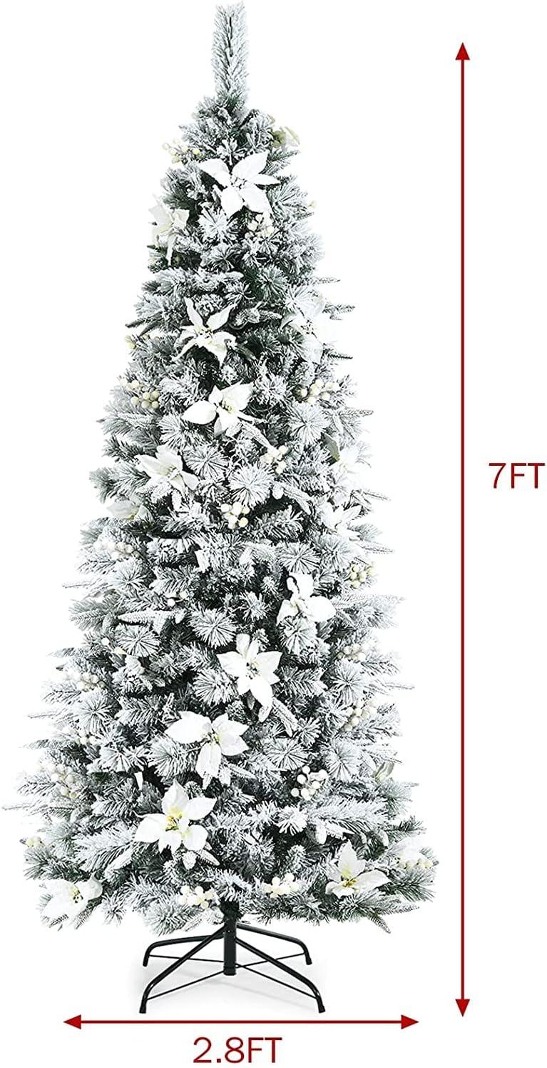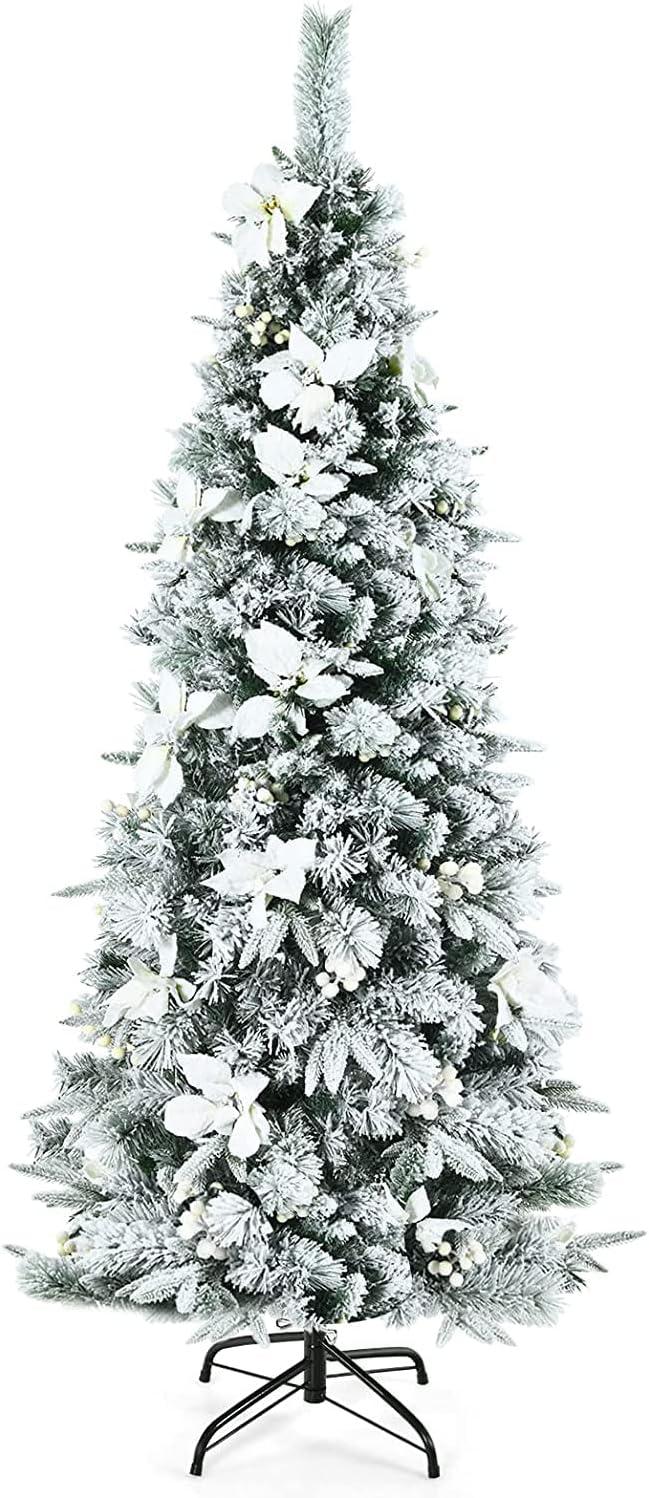 Our snow flocked artificial Christmas tree features dense, lifelike tips, which resembles the appearance of a natural pine tree, suitable for the Christmas seasons. The pre-decorated pure white berries and lily-white flowers look elegant and charming, bringing a holy winter feeling to any indoor and outdoor setting. The tree needles are constructed out of non-allergenic and flame-retardant PVC and PE materials for safe use. Hinged branches attached to the center pole sections allow for easy set-up, take-down, and storage year after year. A sturdy metal stand will keep your tree standing tall all season long. Bring it home and use your imagination to decor it with small ornaments!