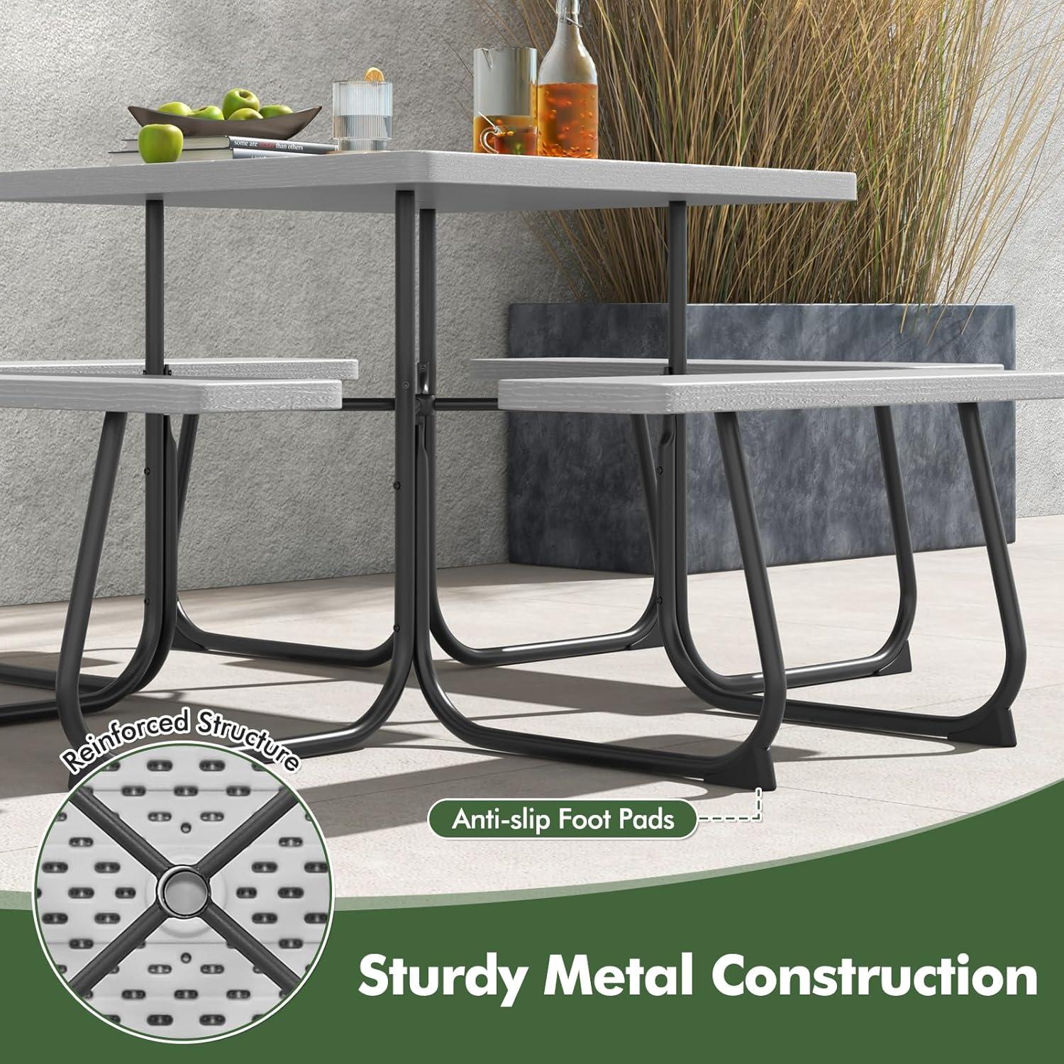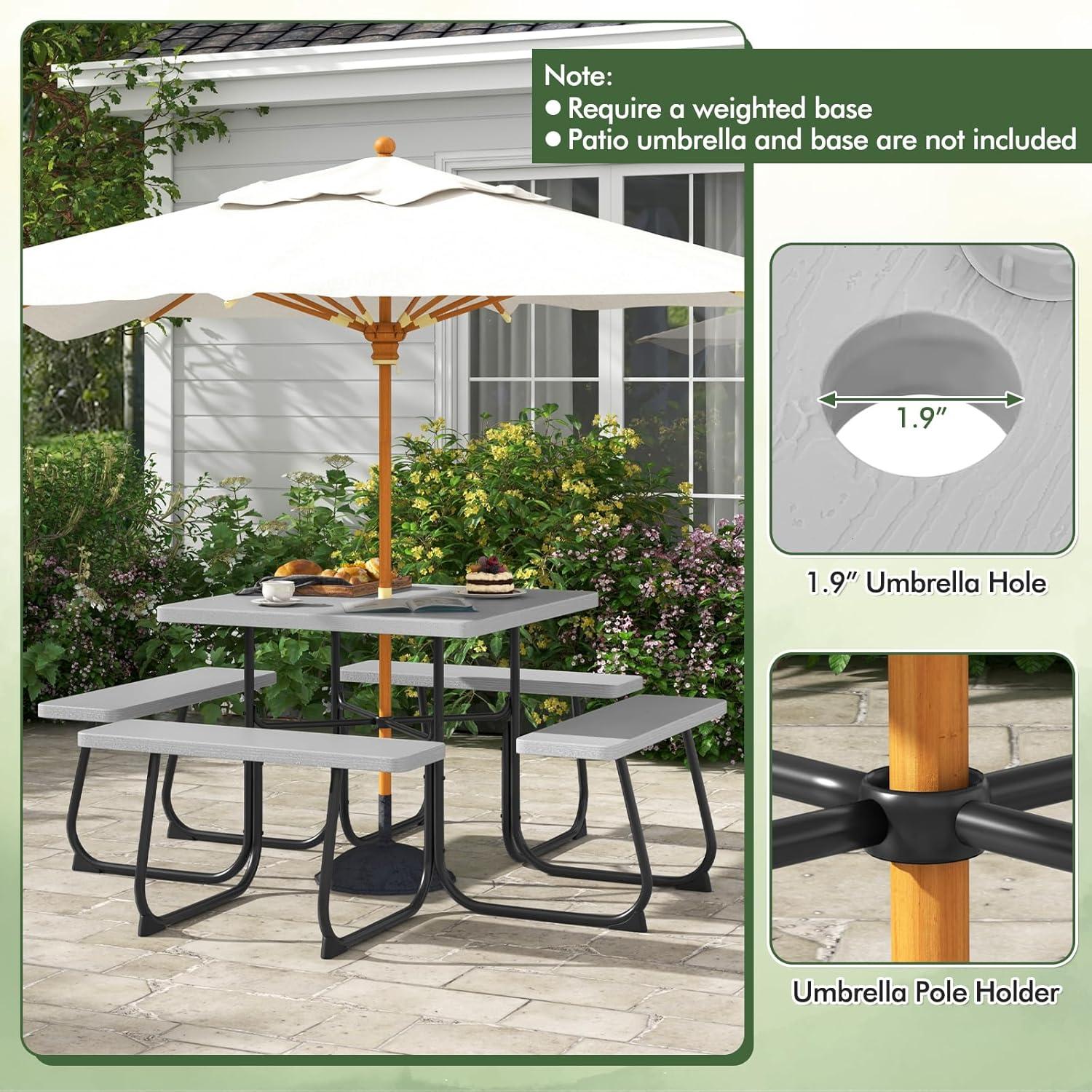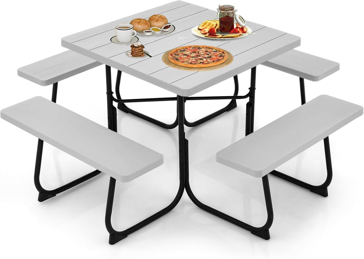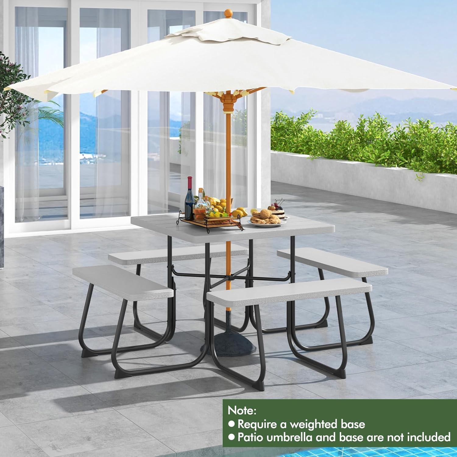 Bring your loved ones together for a perfect outdoor meal with our picnic table set. It seats up to 8 comfortably, thanks to its large tabletop and four built-in benches. The sturdy powder-coated metal frame ensures stability, while the premium HDPE tabletop is easy to clean and crack-resistant. Plus, the built-in central hole makes it easy to add a patio umbrella for shade. This versatile set is perfect for any setting—whether it’s your lawn, backyard, or poolside. Say goodbye to mismatched tables and chairs and enjoy seamless outdoor dining with our all-in-one picnic table set.