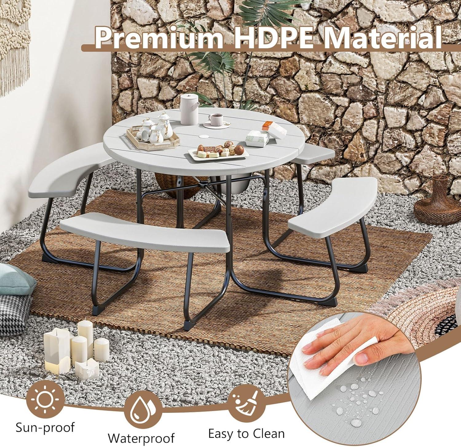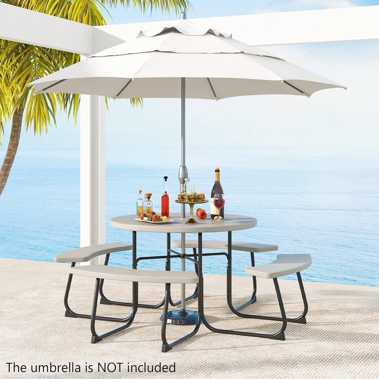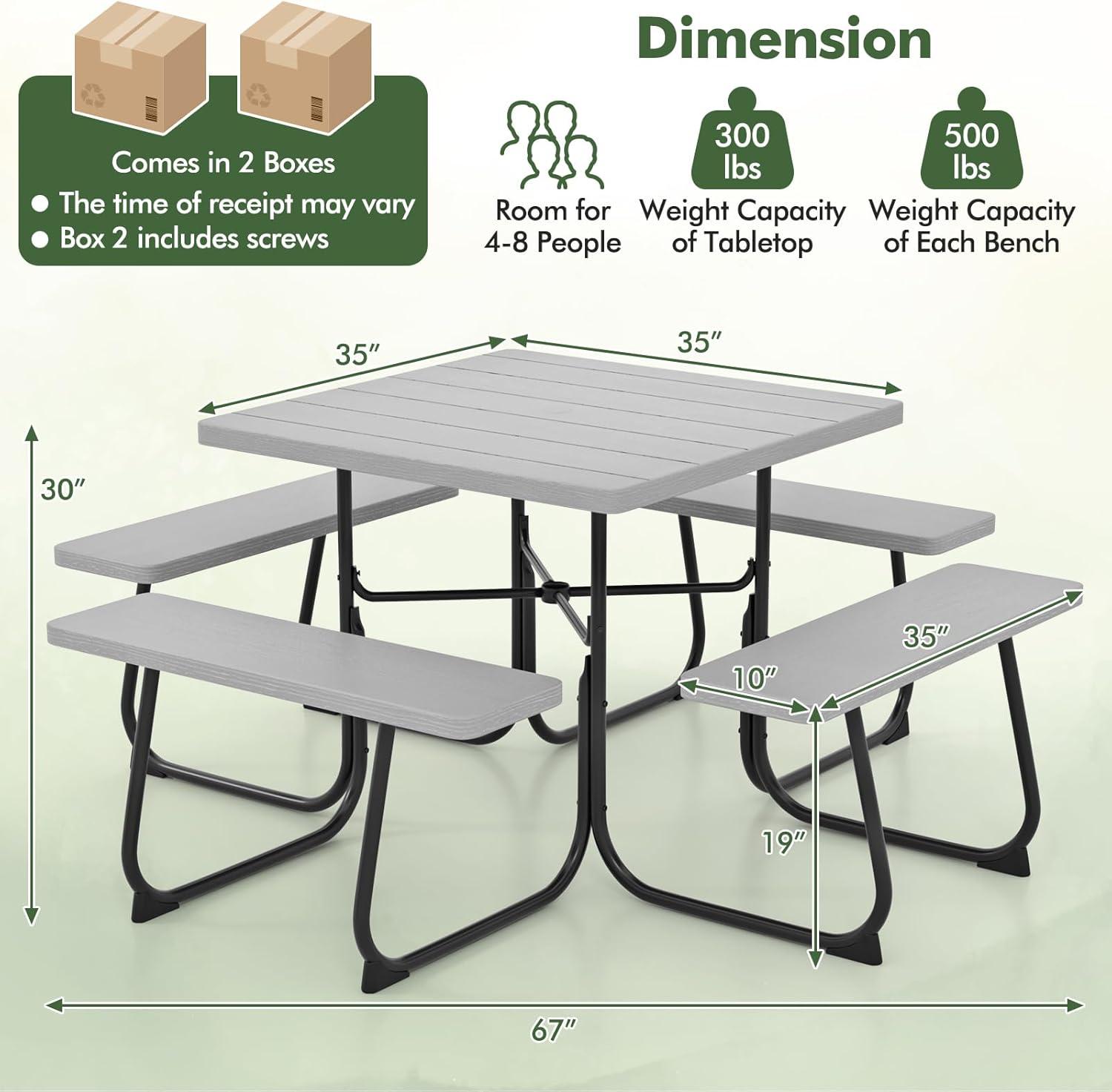 Bring your loved ones together for a perfect outdoor meal with our picnic table set. It seats up to 8 comfortably, thanks to its large tabletop and four built-in benches. The sturdy powder-coated metal frame ensures stability, while the premium HDPE tabletop is easy to clean and crack-resistant. Plus, the built-in central hole makes it easy to add a patio umbrella for shade. This versatile set is perfect for any setting—whether it’s your lawn, backyard, or poolside. Say goodbye to mismatched tables and chairs and enjoy seamless outdoor dining with our all-in-one picnic table set.