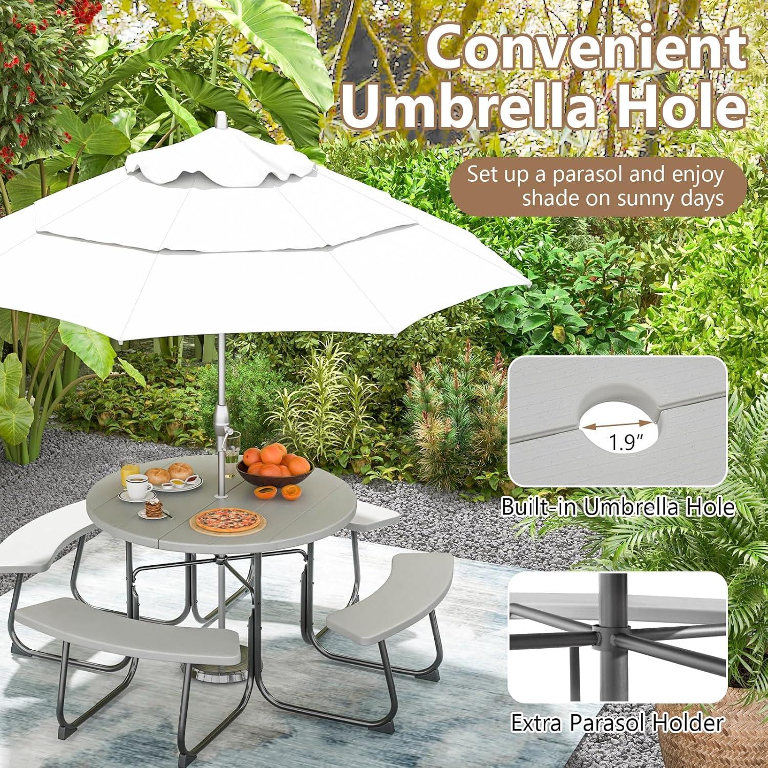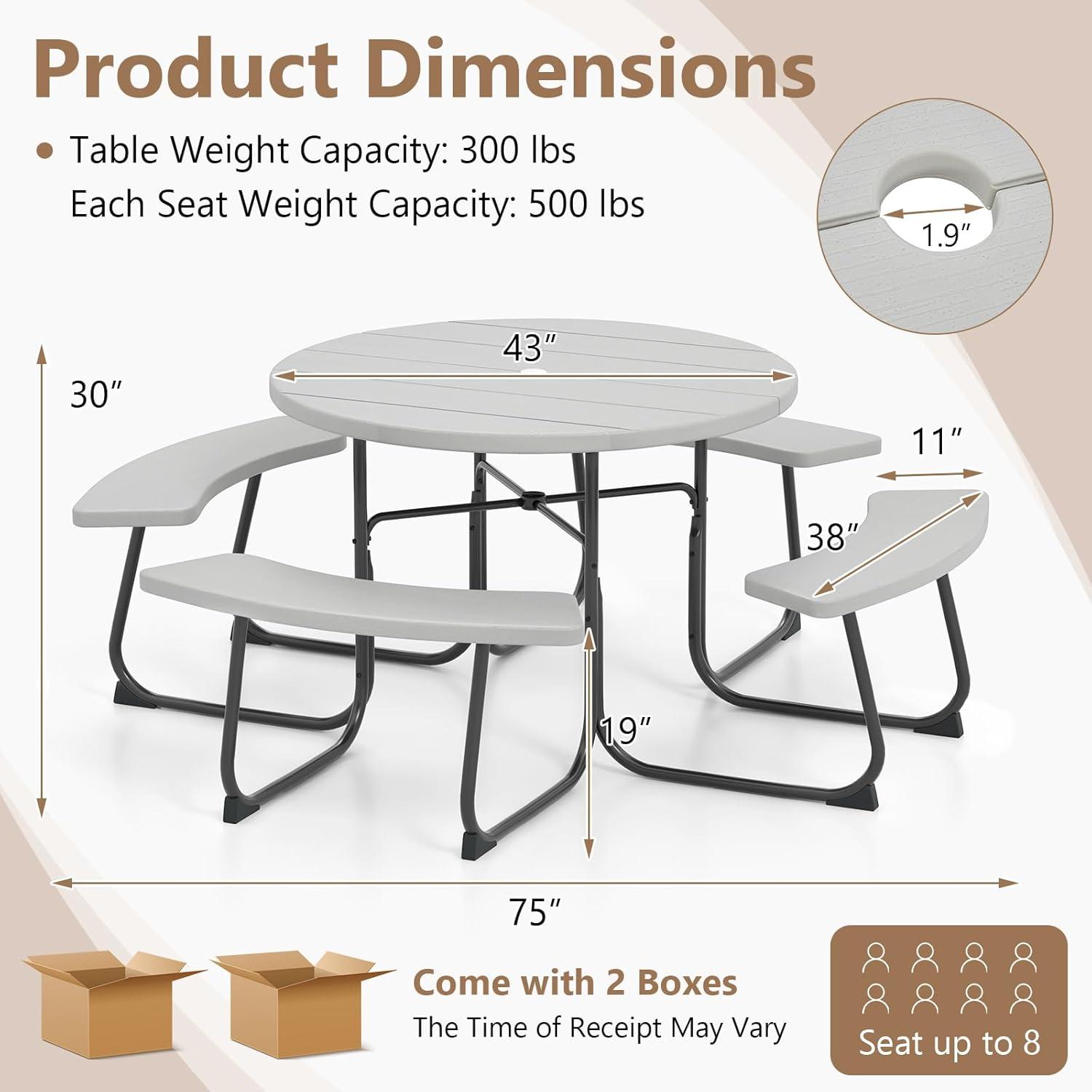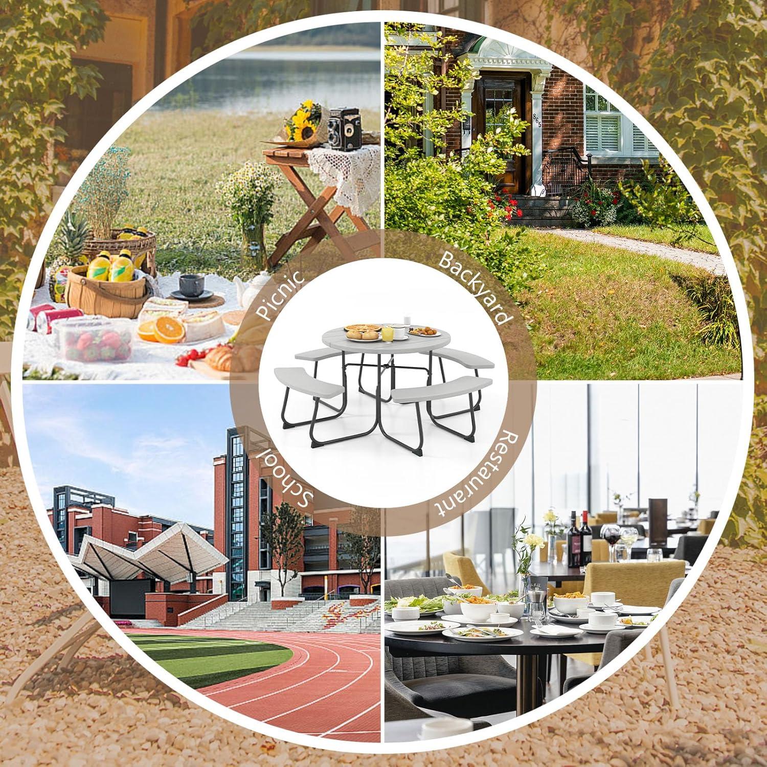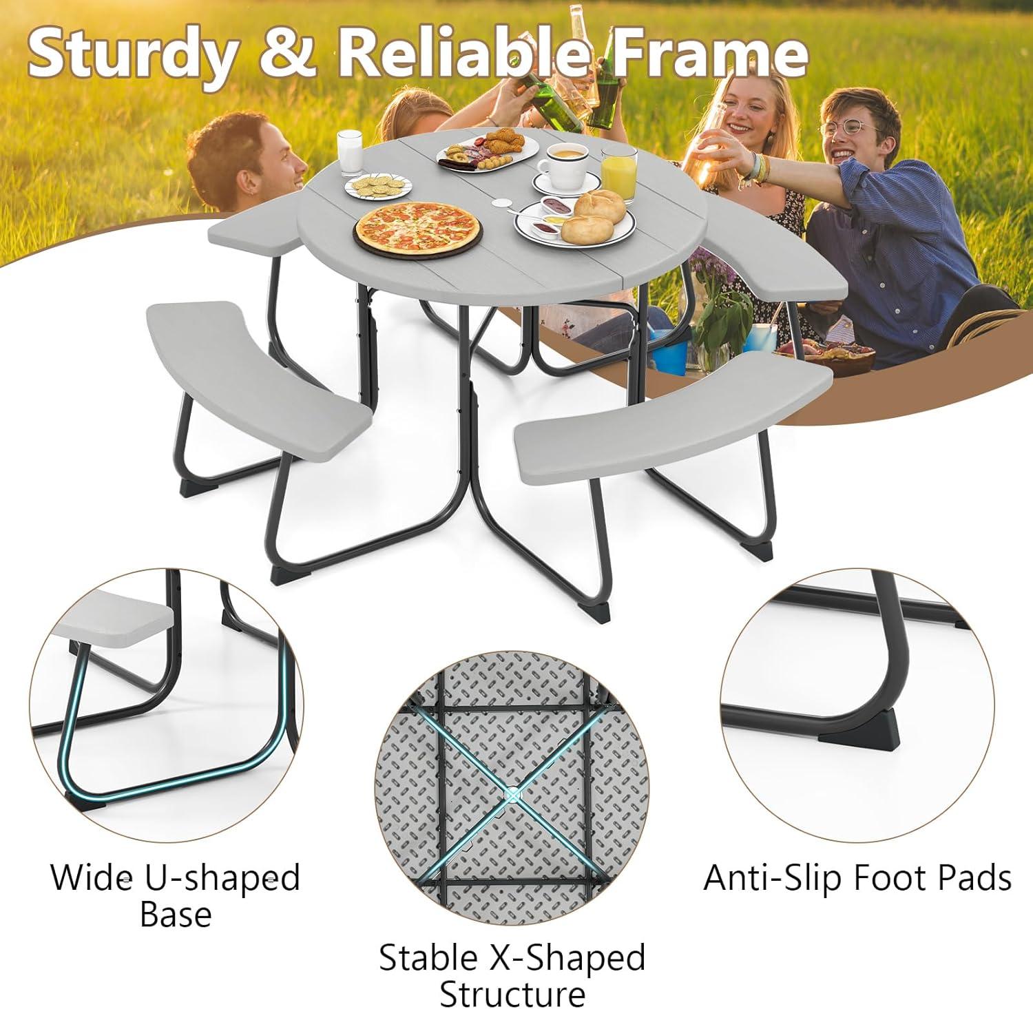 Bring your loved ones together for a perfect outdoor meal with our picnic table set. It seats up to 8 comfortably, thanks to its large tabletop and four built-in benches. The sturdy powder-coated metal frame ensures stability, while the premium HDPE tabletop is easy to clean and crack-resistant. Plus, the built-in central hole makes it easy to add a patio umbrella for shade. This versatile set is perfect for any setting—whether it’s your lawn, backyard, or poolside. Say goodbye to mismatched tables and chairs and enjoy seamless outdoor dining with our all-in-one picnic table set.