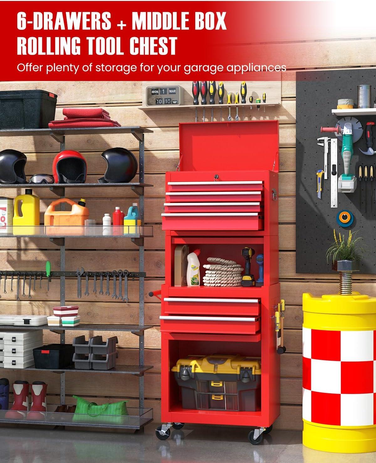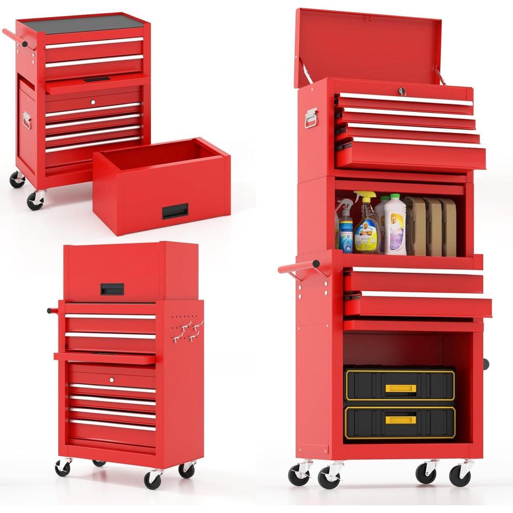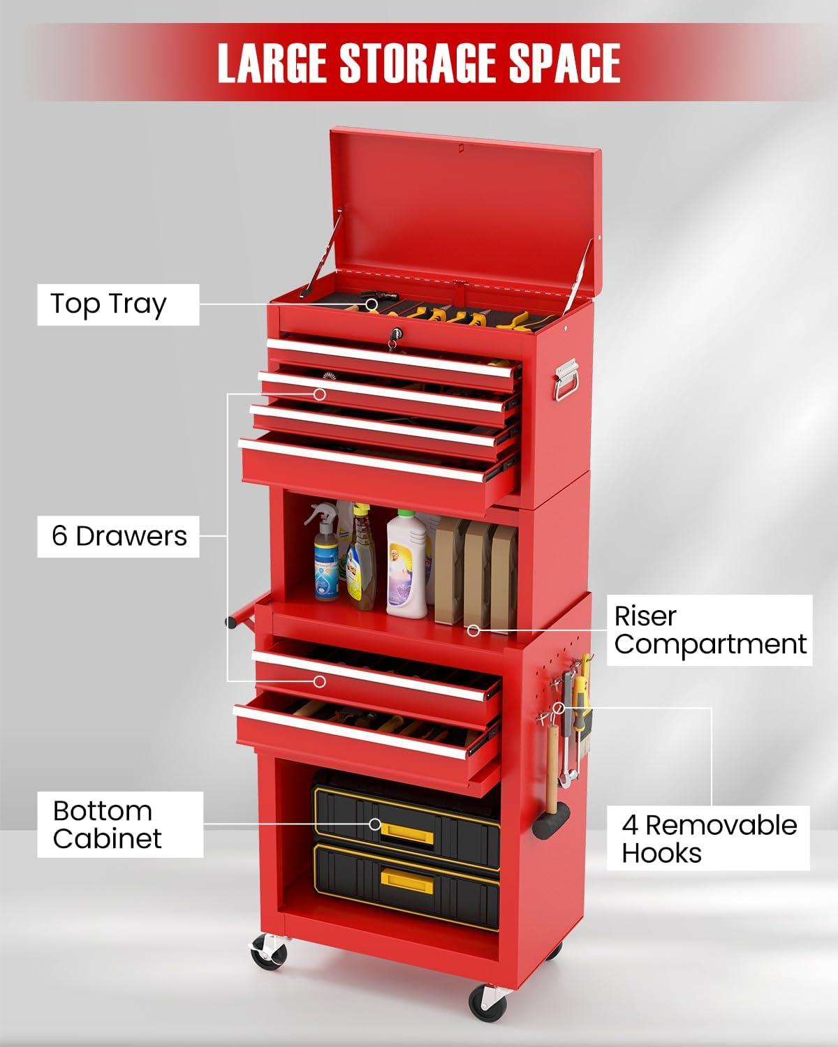3-in-1 Design: This rolling tool box with wheels offers a versatile modular design, combining a top box, riser, and bottom cabinet. Each section can be detached for independent use, making it easy to organize and access tools. You can also stack the top box inside the bottom cabinet for space-saving storage or easy transport