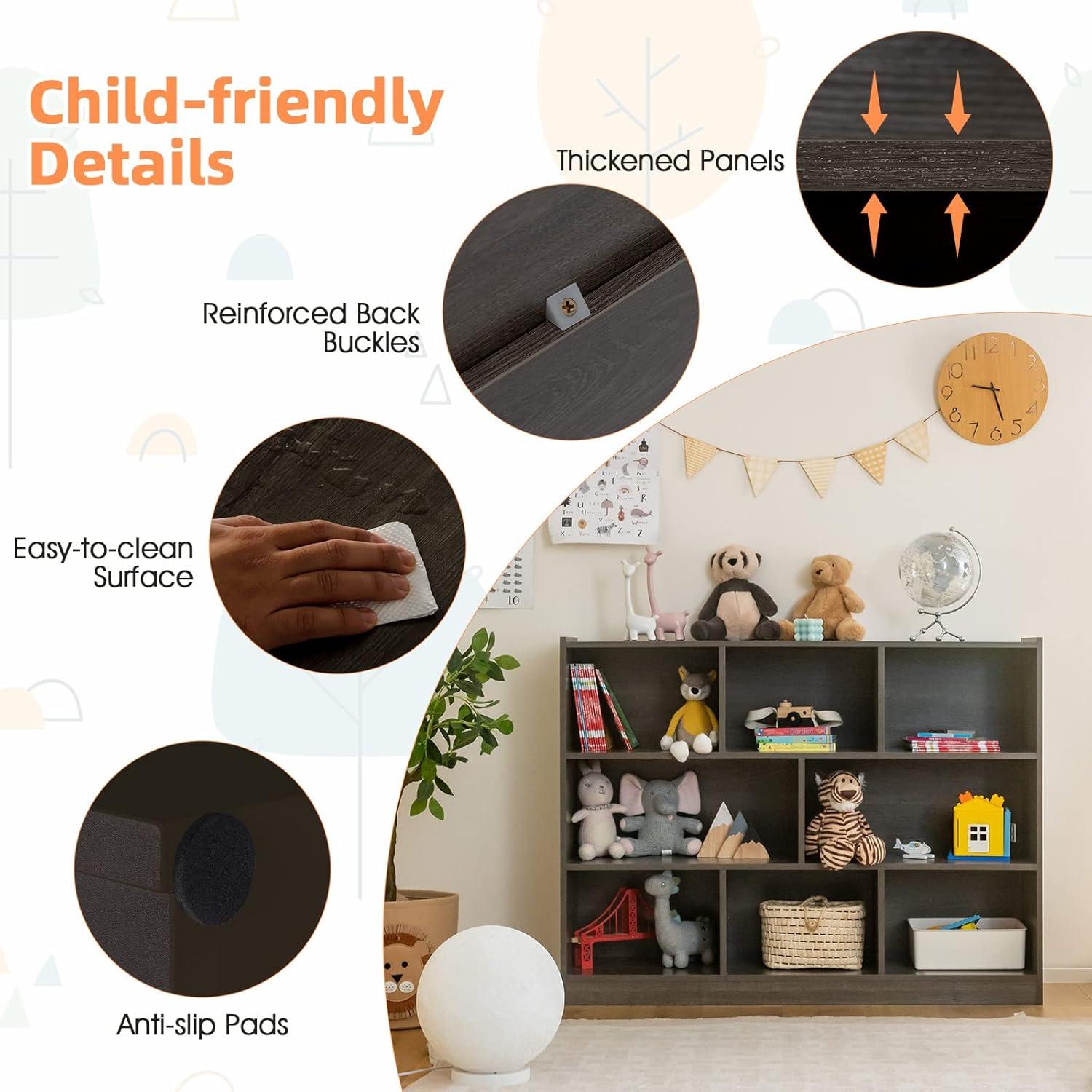 This cabinet furniture it can not only be used as a toy organizer, but also as a bookcase or toy and handicraft display cabinet, which is multifunctional and practical. The storage cabinet is designed with 2 spacious open compartments and 6 smaller compartments for all types of toy storage needs. The whole bookcase is made of thickened engineering board for a solid structure, the top can hold up to 133 pounds and each compartment can also hold up to 44 pounds. The equipped non-slip feet is to ensure safe use. The organizer is easy to assemble, requires no professional tools, and is extremely easy to clean and maintain on a daily basis. What's more, it can help children develop good habits of sorting, organizing and repositioning, cultivate children's sense of storage from childhood, and lay a solid foundation for future learning and life.