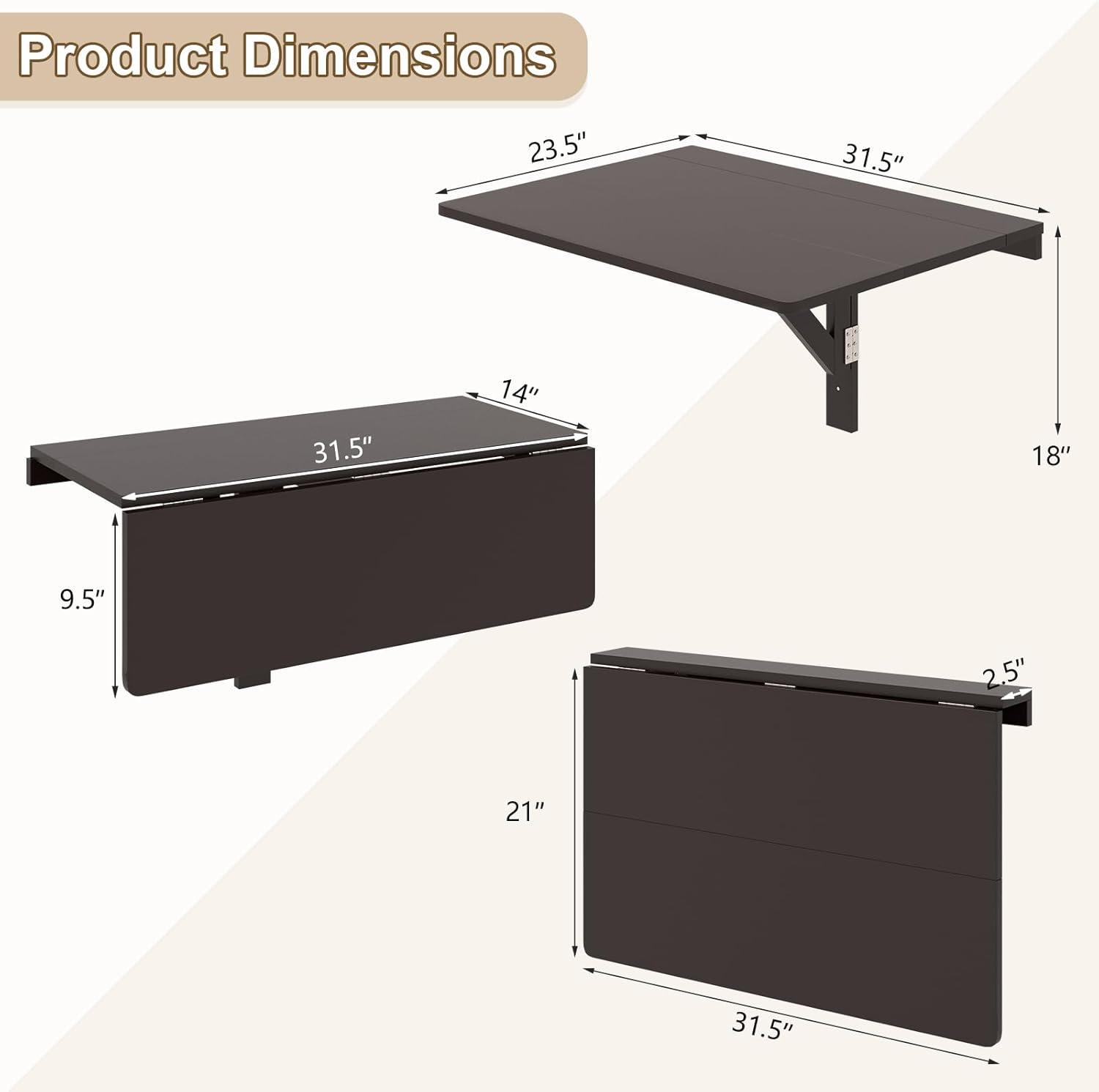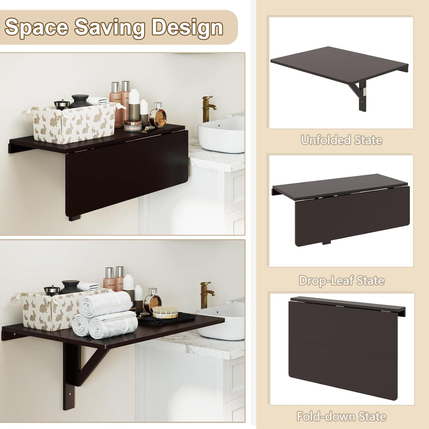 Wall-Mounted Desk, 31.5″ x 23.5″ Dual Folding Workbench, Drop-Leaf Foldable Table, Space-Saving Folding Desk for Small Spaces, Kitchen, Laundry Room, Home, Office (White)(Coffee)