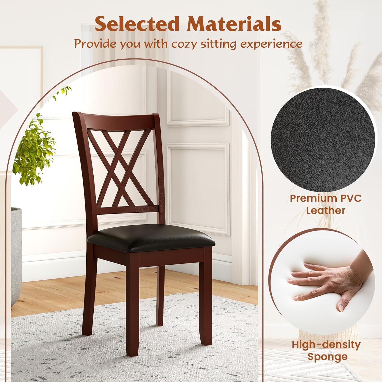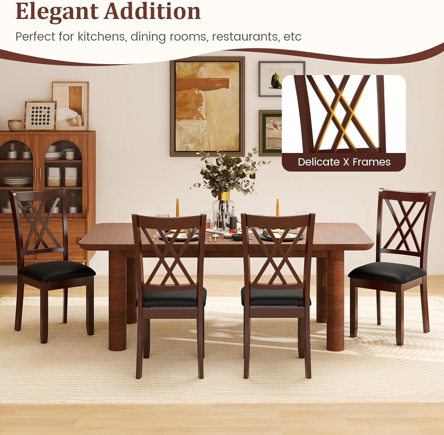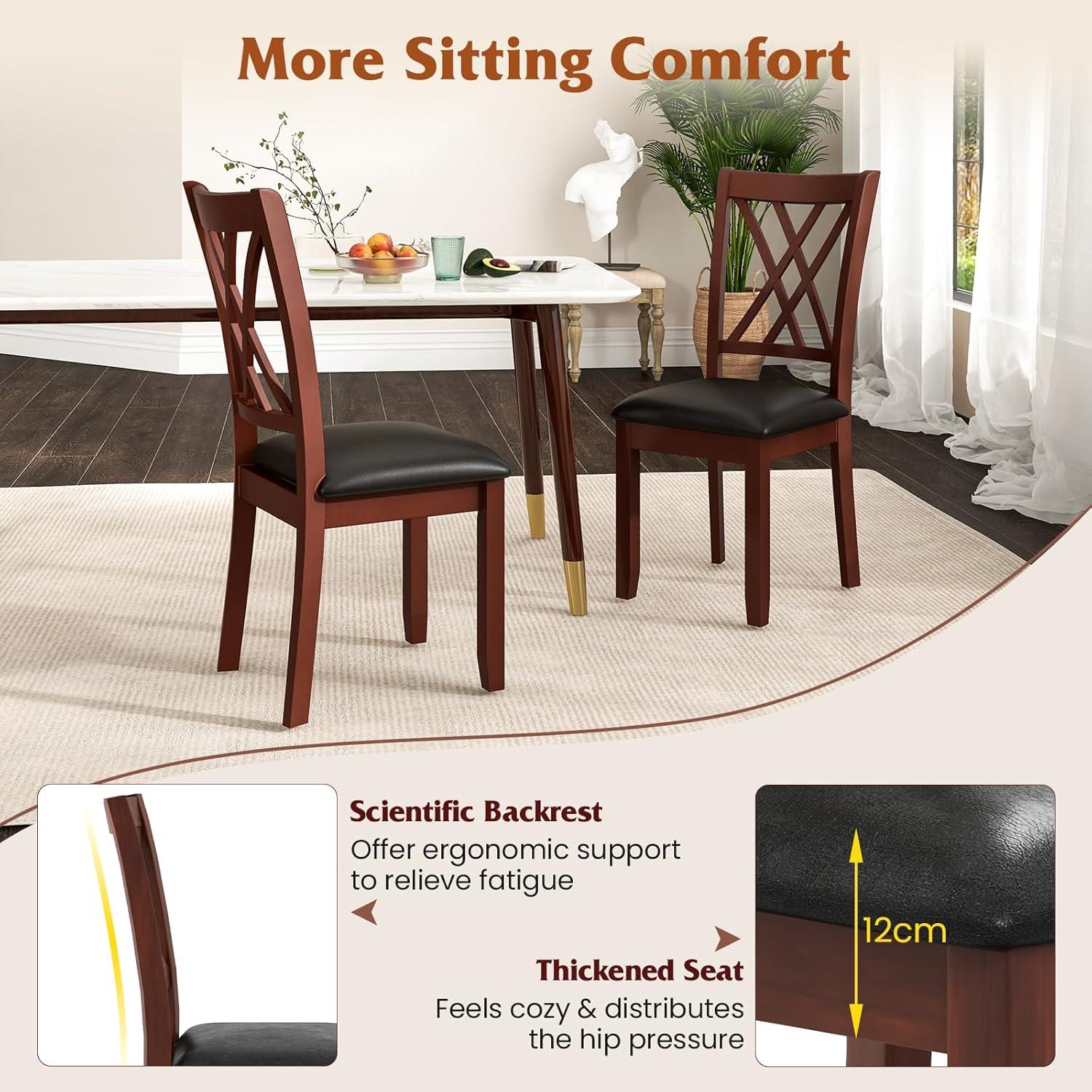 Crafted from solid wood and wrapped in supple faux leather, each seat offers long-lasting support and an easy-wipe surface for daily life. Gentle padding cushions every meal, while the curved backrest follows the natural line of the spine to reduce fatigue. Subtle X-shaped framing adds visual lightness without sacrificing strength, and discreet foot pads keep floors pristine. Their quiet versatility suits kitchen nooks, open-plan dining rooms, cafés and bistros alike, lending warmth and order wherever people gather to eat, talk or rest a moment longer.