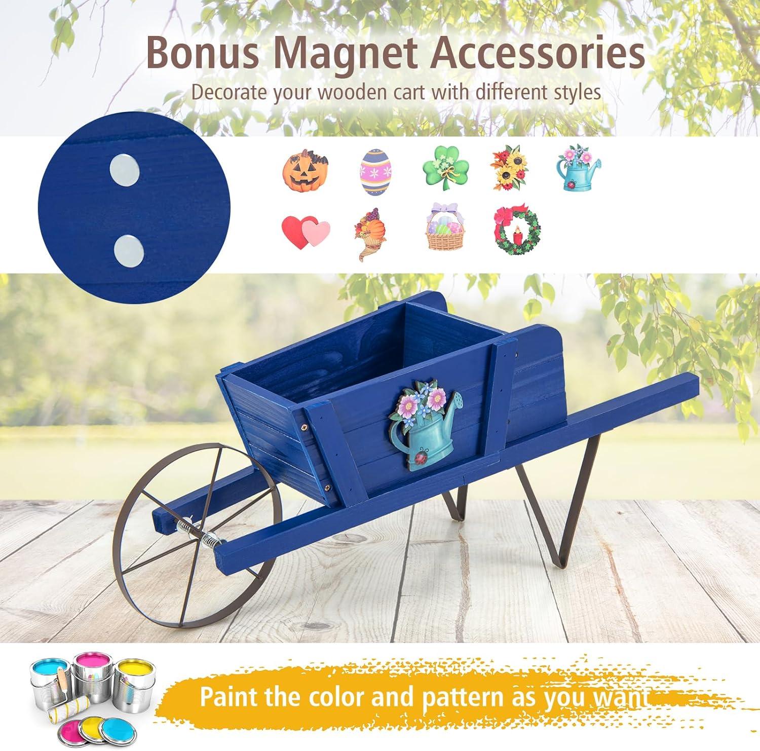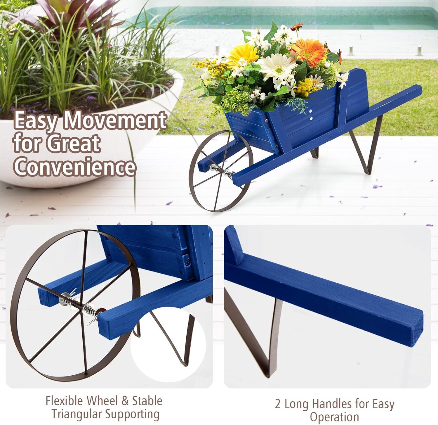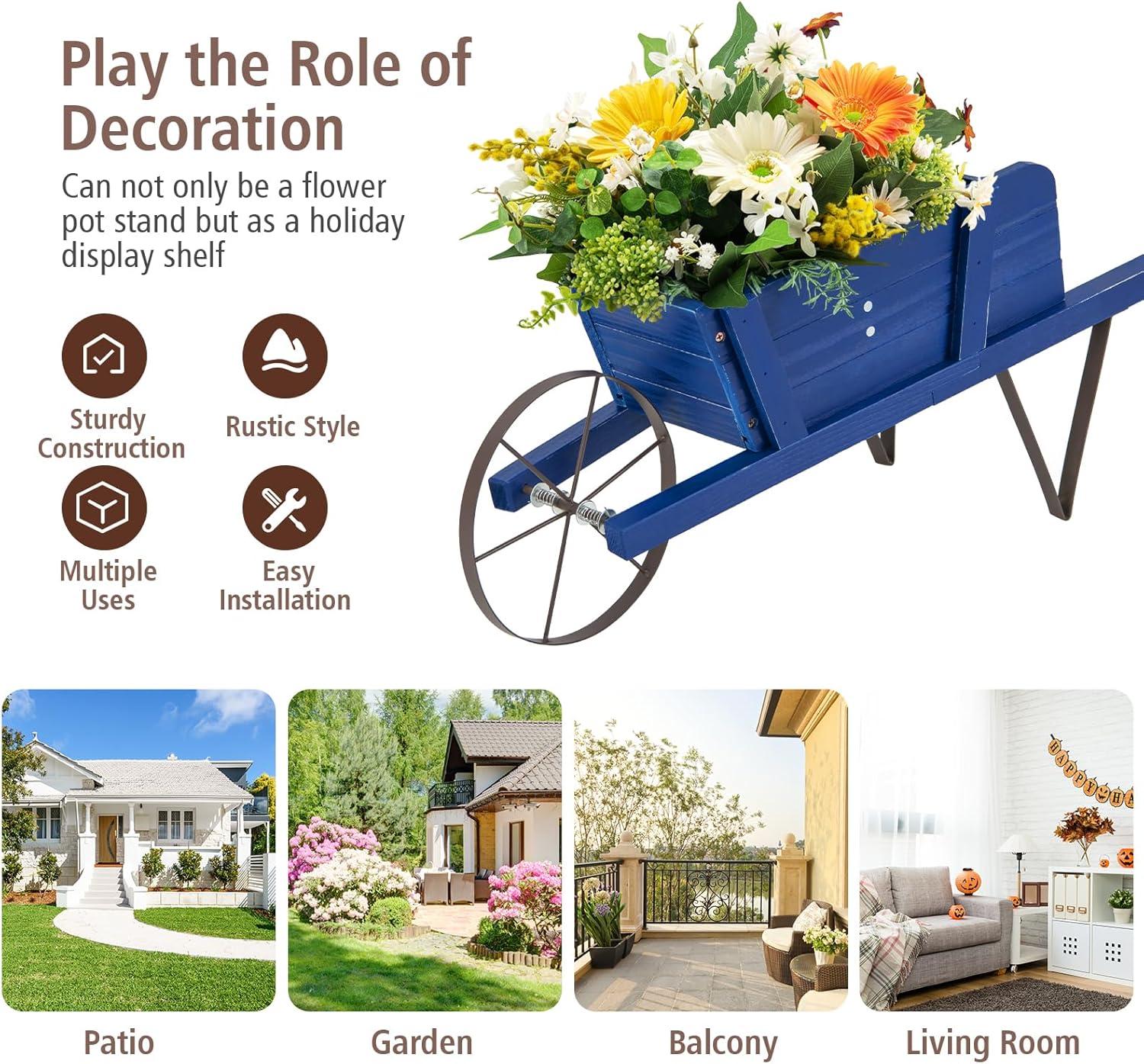 Wooden Wagon Planter, 27.5"x10.5"x11.5" Wheelbarrow Cart Plant Pot with Halloween Decoration & Mental Supports, Single Wheel Movable Garden Flower Cart Planter for Yard, Backyard (Blue)(Blue)
