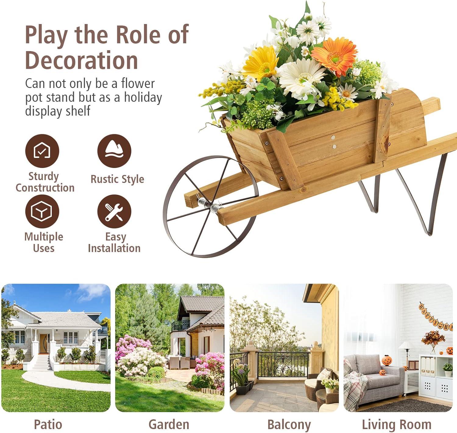 Excellent Quality: This wooden wheelbarrow planter is made of solid pine wood and rust-proof iron for a sturdy structure and long service life. The solid wood construction is resistant to deformation and the slats are smooth and burr-free for protecting your hands from scratches.