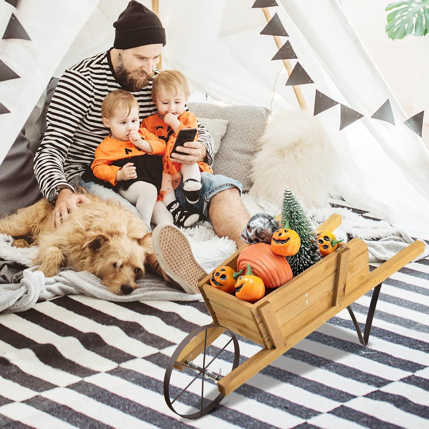 Wooden Wagon Planter, 27.5"x10.5"x11.5" Wheelbarrow Cart Plant Pot with Halloween Decoration & Mental Supports, Single Wheel Movable Garden Flower Cart Planter for Yard, Backyard (Blue)(Walnut)
